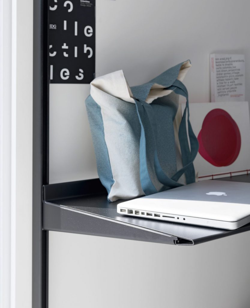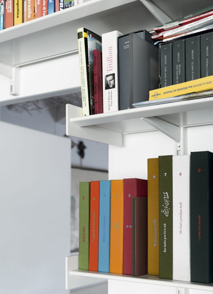 Dot is a versatile system designed to furnish any space in the home, a light design element consisting of a few simple components that can lead to a multitude of solutions. It comprises narrow painted sheet metal shelves and light extruded anodized aluminium uprights, available in six different sizes or custom-made. Accessories such as side panels, bookends, lighting tubes, clothes hooks and wall storage units provide many other options for use: from the living room, where Dot is a minimalist bookcase that almost disappears, to the kitchen, the home of?ce corner, the wardrobe and the closet at the entrance. This versatile design project helps you organise every room in the home, as you desire.