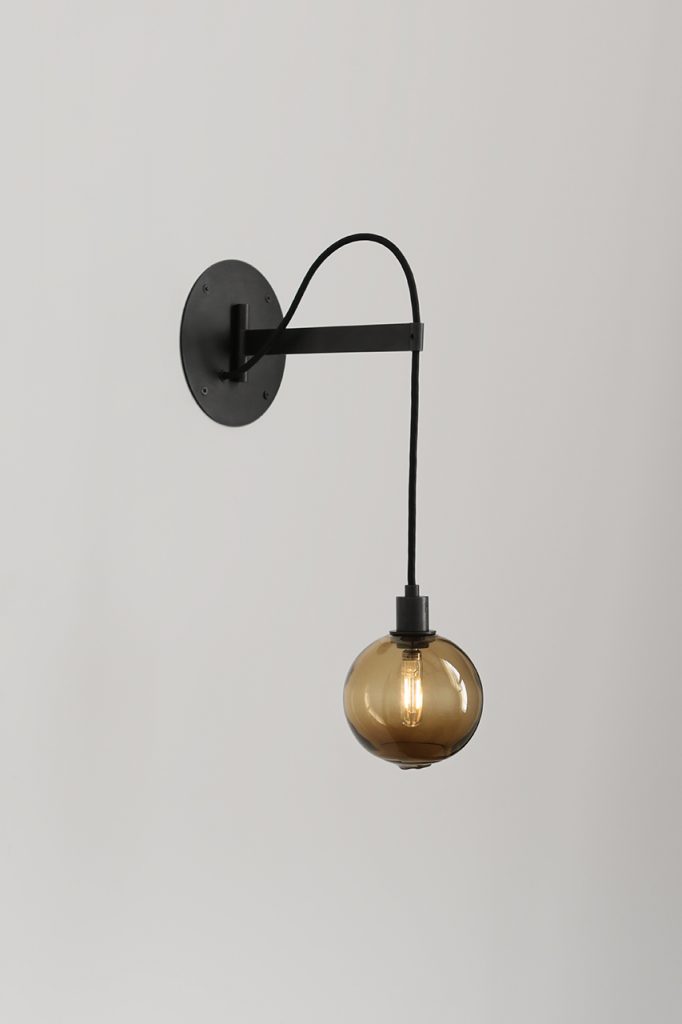 The Drape Arm 1 Sconce is a single-lit sphere of handblown glass suspended from a moveable arm. There are two versions with different lengths of the arm. The spherical shade is available in two sizes and is suspended from the arm on a fabric-wrapped electrical cord. The exposed cord passes through the end of the arm and returns to the canopy at the wall. Solid brass construction throughout, the arm is hinged for a full 180-degree swing and is available in two lengths.