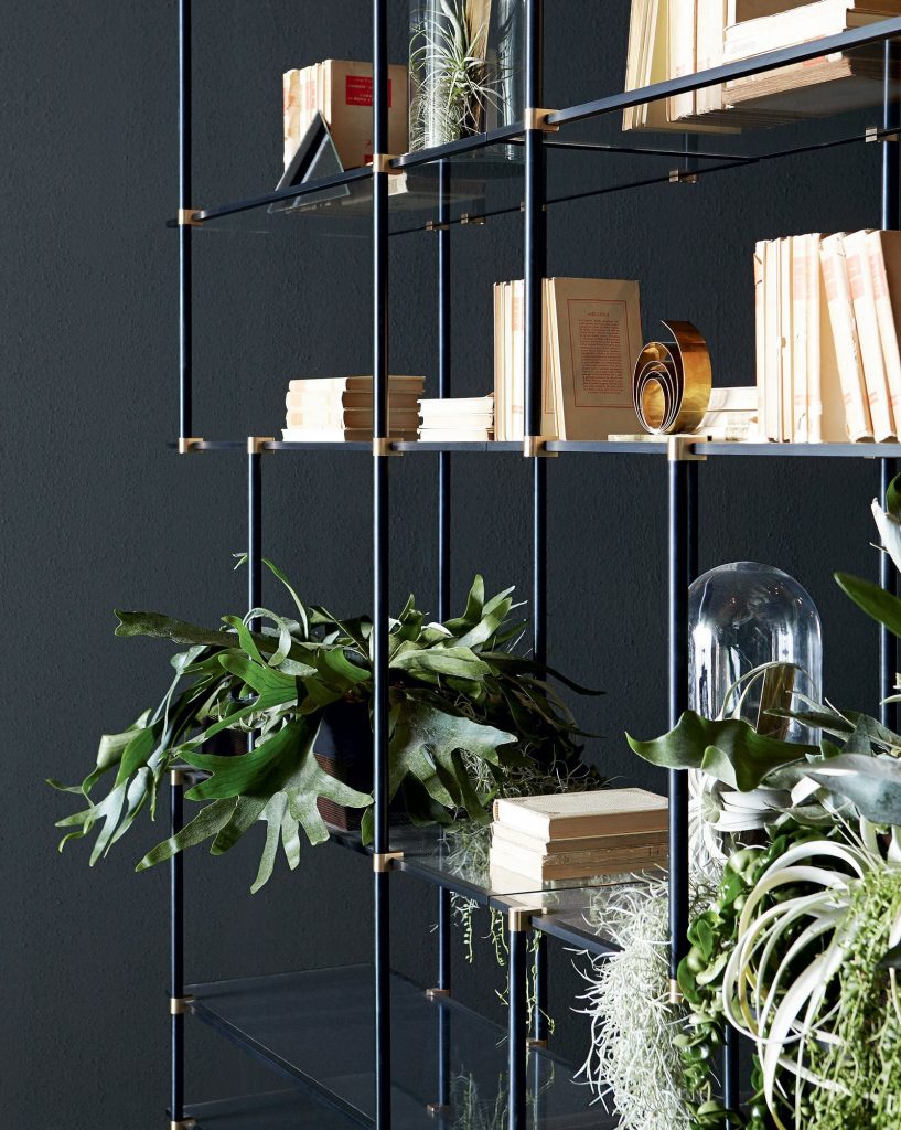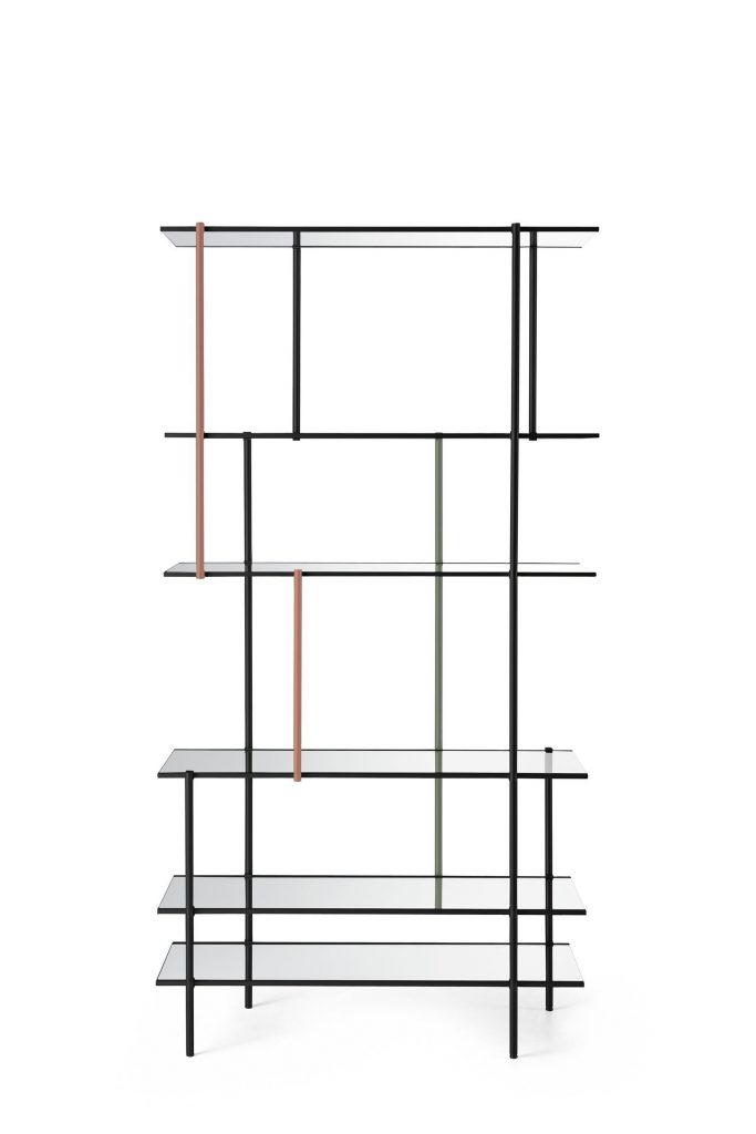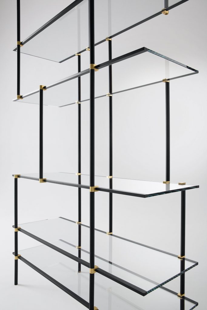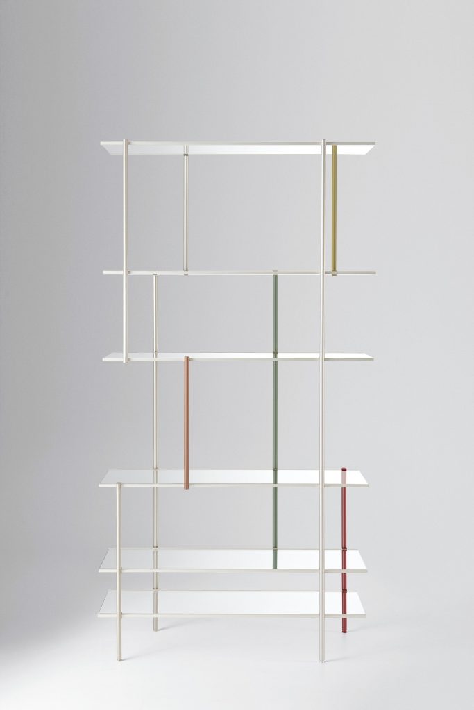 Shelving system with champagne or black anodised aluminium structure. Set of vertical lacquered supports in the colours grey, mustard, red or pink, on request. 10mm extralight transparent tempered glass shelves. Available also smoked 'grigio Italia' glass. Satin brass shelf supports, on request.