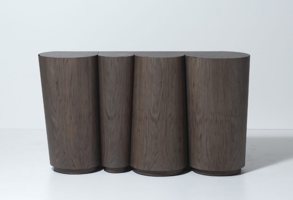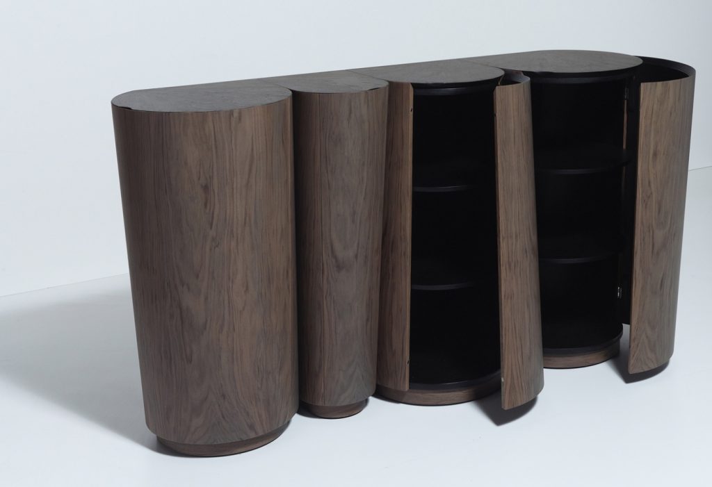 Sideboards composed by conical elements joined with each other. Structure and doors made of veneered multilayer curved wood. Inner spaces equipped with 2 shelves each, in the same veneer of the structure.