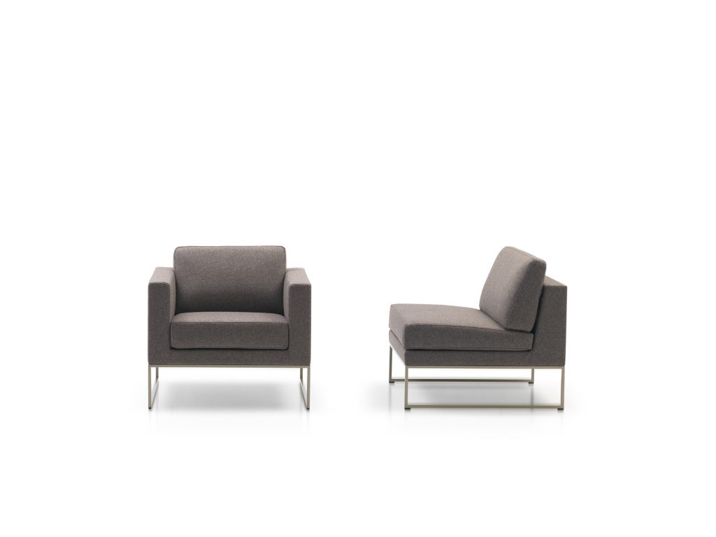Maximum design, maximum flexibility. Five individual elements of 80 x 80 cm form the basis of the high quality seating arrangements: available as an individual armchair with armrests, chair without armrests as an intermediate element, two side elements with right or left armrest and a stool. A screw connection is provided for the square stainless steel frame. A 40 x 80 cm glass plate can be slotted between the seating elements or the 80 x 80 cm glass table as storage space.