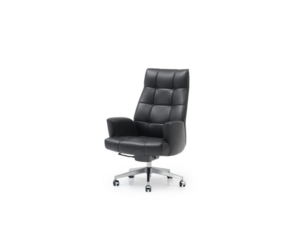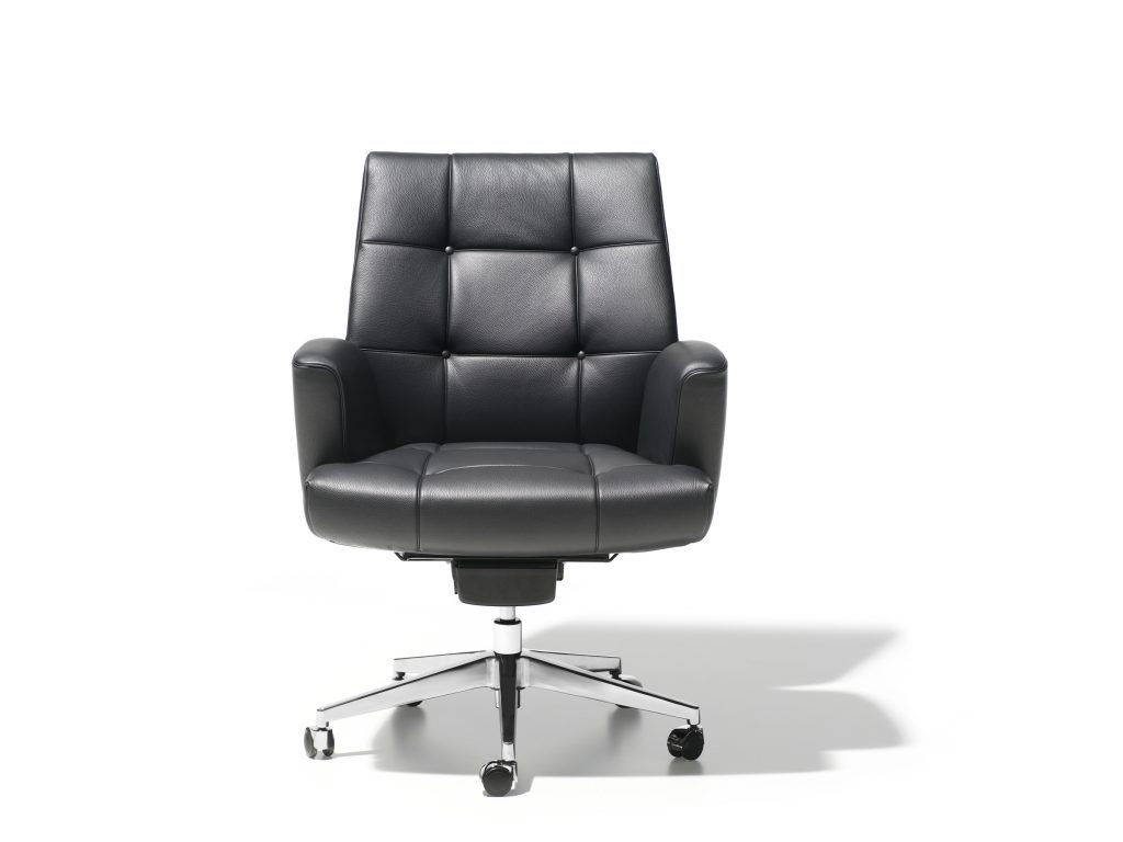 The executive armchair par excellence with a sense of tradition and a fine sense of luxury. Dynamic shape with forward-sweeping armrests and comfortable upholstery for sitting for long periods. Adjustable height and seat angle for additional comfort. Foam seat shell on a chrome-plated metal column. Stable five-star base in polished aluminium provides the necessary mobility at a desk. Available with hard or soft castors.