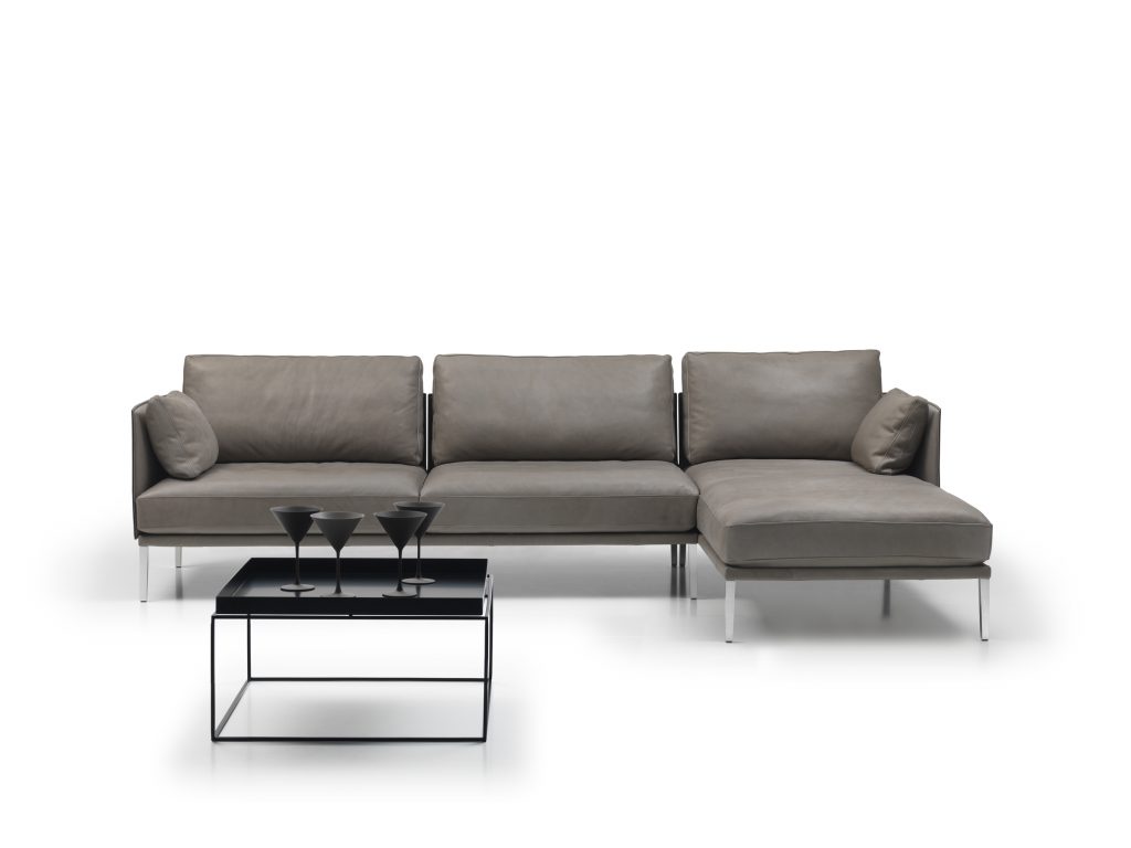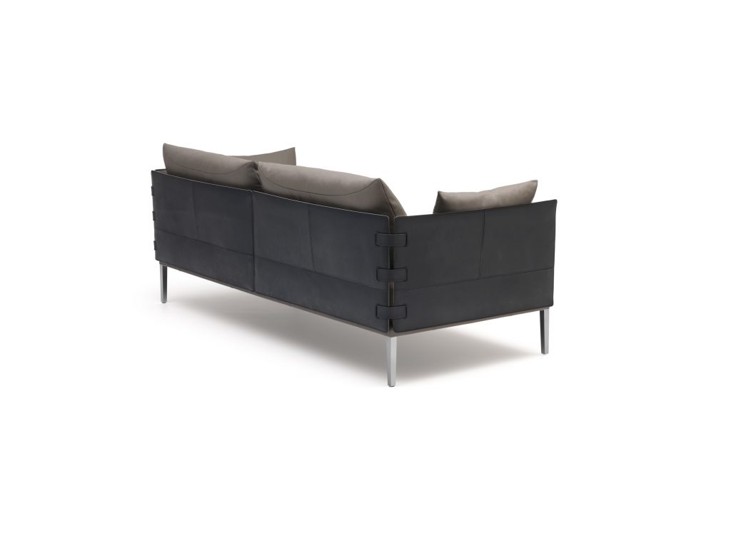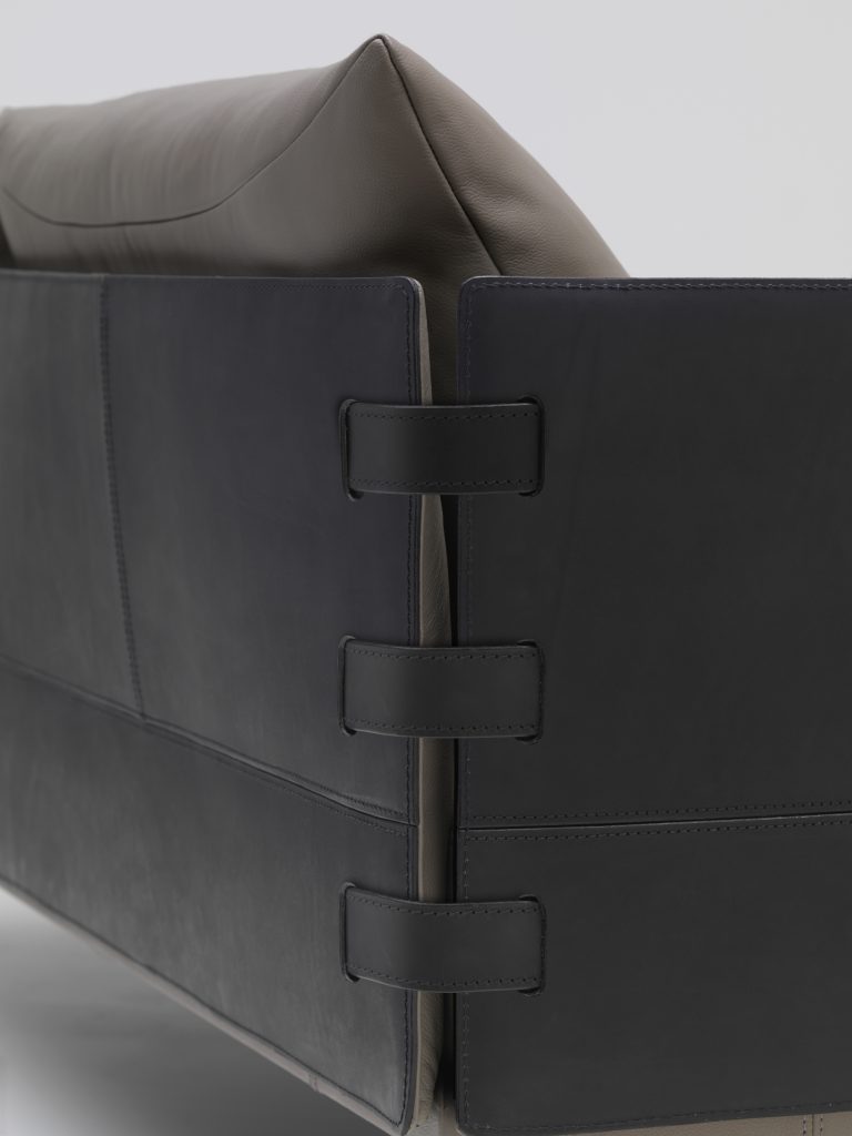 Charming appearance with a fascinating interplay of exquisite leathers. Perfect combination of clean, clear lines with soft, flowing shapes. The leather connecting straps are reminiscent of those on old-fashioned suitcases and bags. Opulent smooth cushions with velvety-soft leather or fabric cover. Slender feet of different materials. Adjustable armrests.