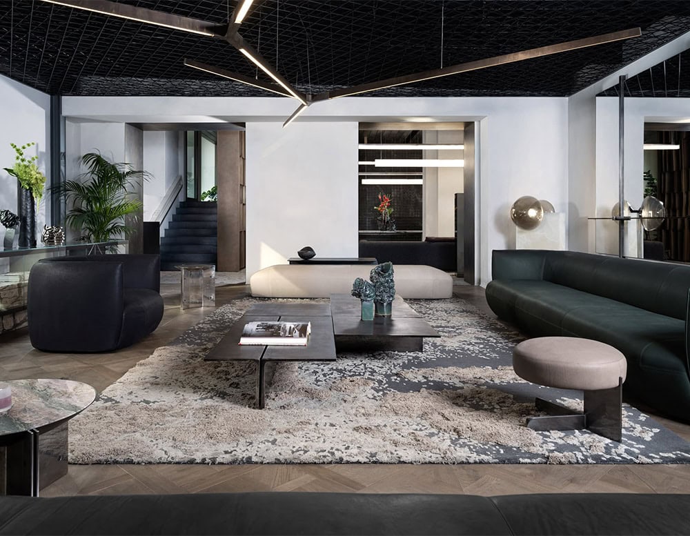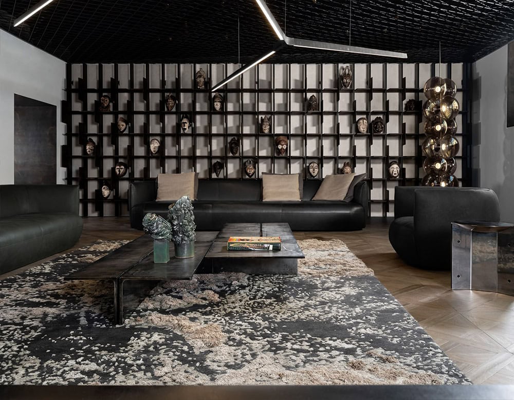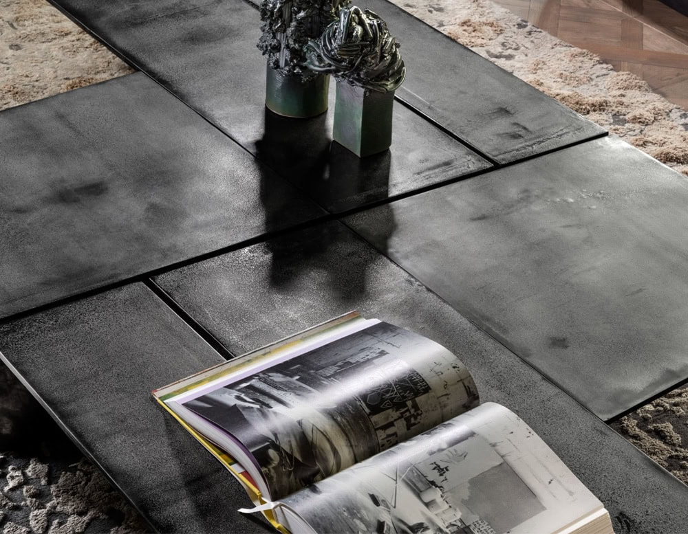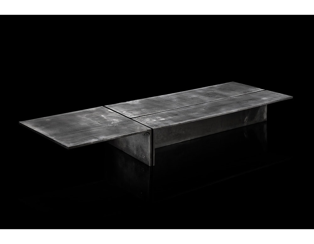 Aim to distill the form in its purest representation leads to the graphic incisiveness and dynamic rigor of a minimalistic, sculptural sign. The robust linear act celebrates the powerful expressive quality of metal, emanating a visionary futuristic character.