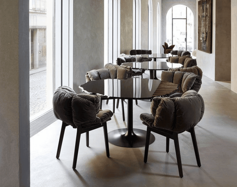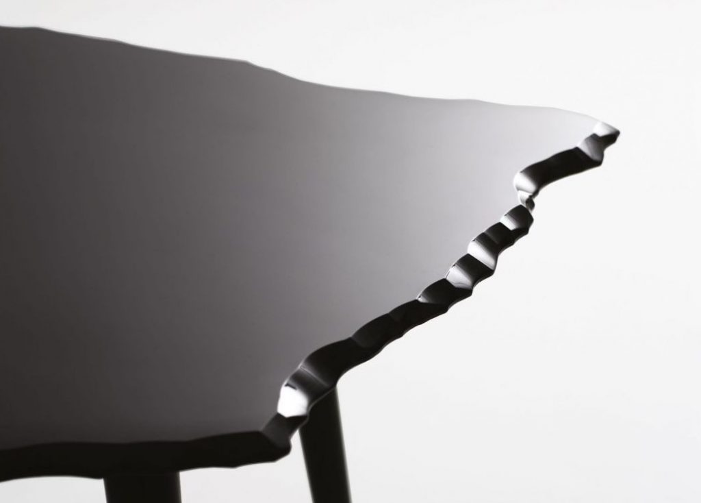 A splinter. A big fragment of faceted glass with a thick irregular edge that recalls the rugged coastline of the islands of the Egeo sea, from which it takes the name. Each piece is unique and hand finished. This series of glass tables with irregular, elliptical or round tops.