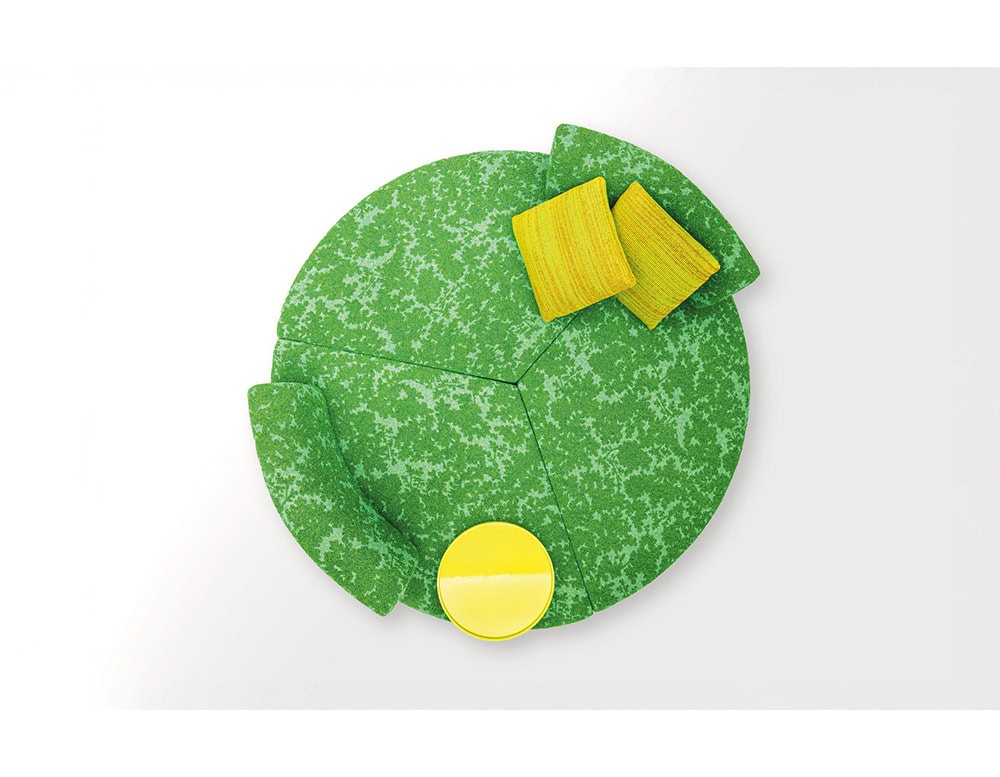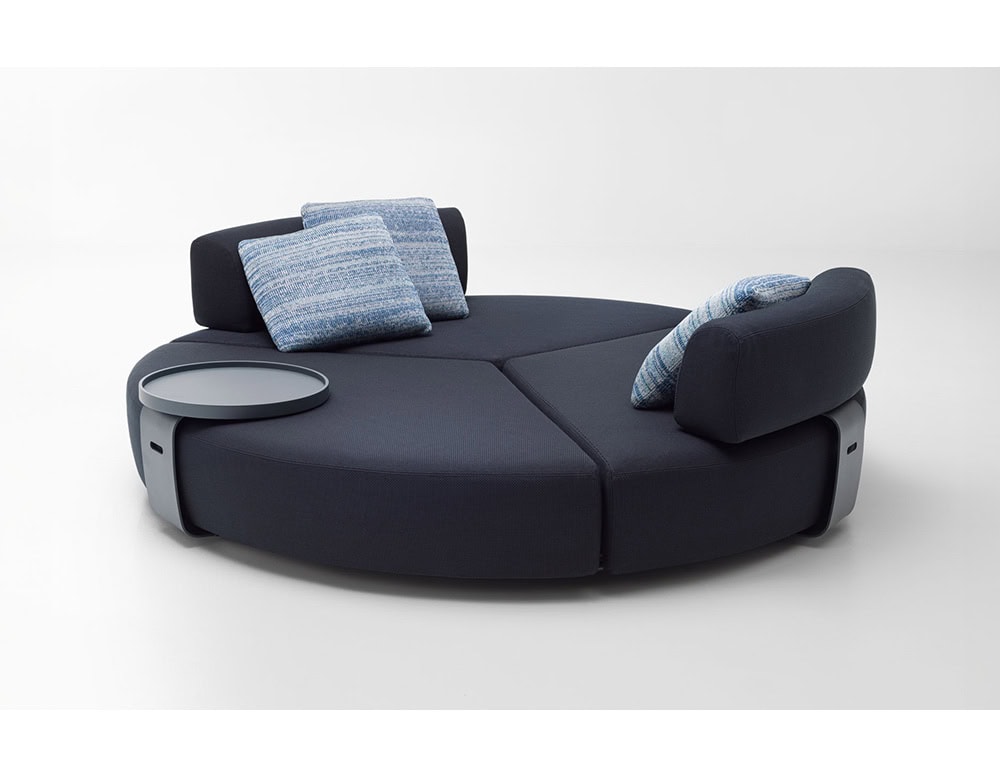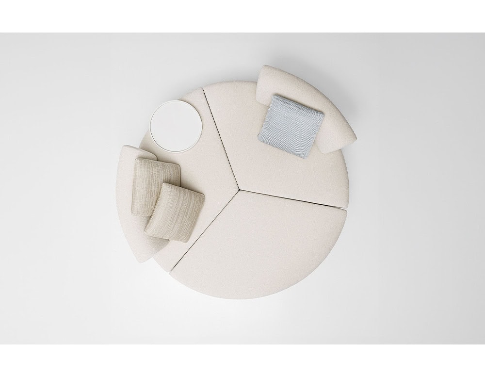 The seating area is divided into three sections and shaped to conceal the steel base, revealing only part of the feet.