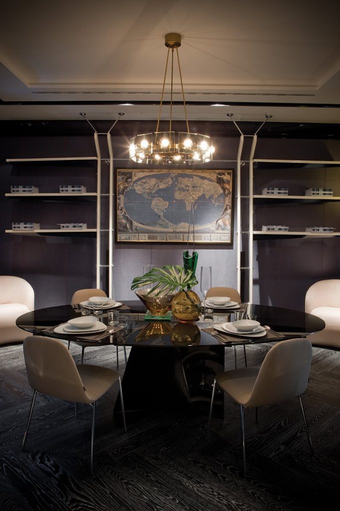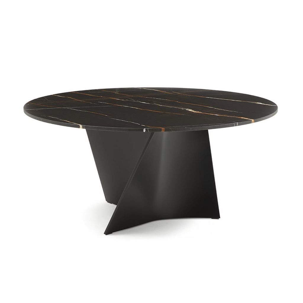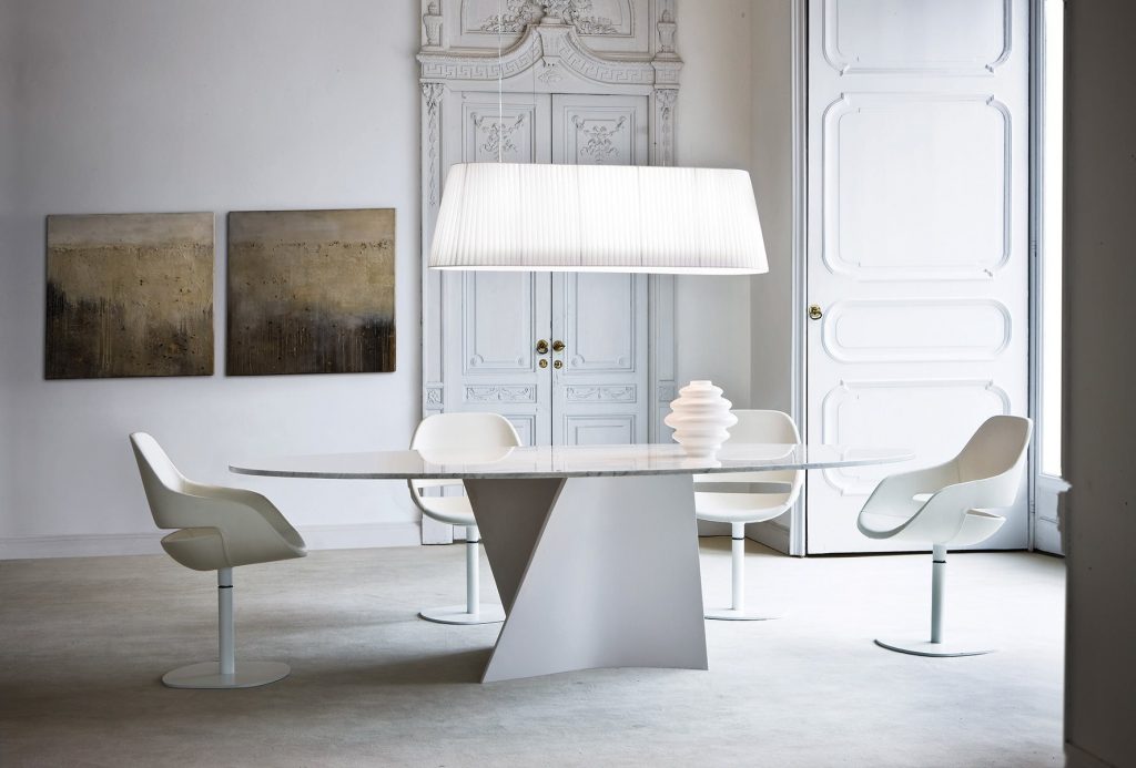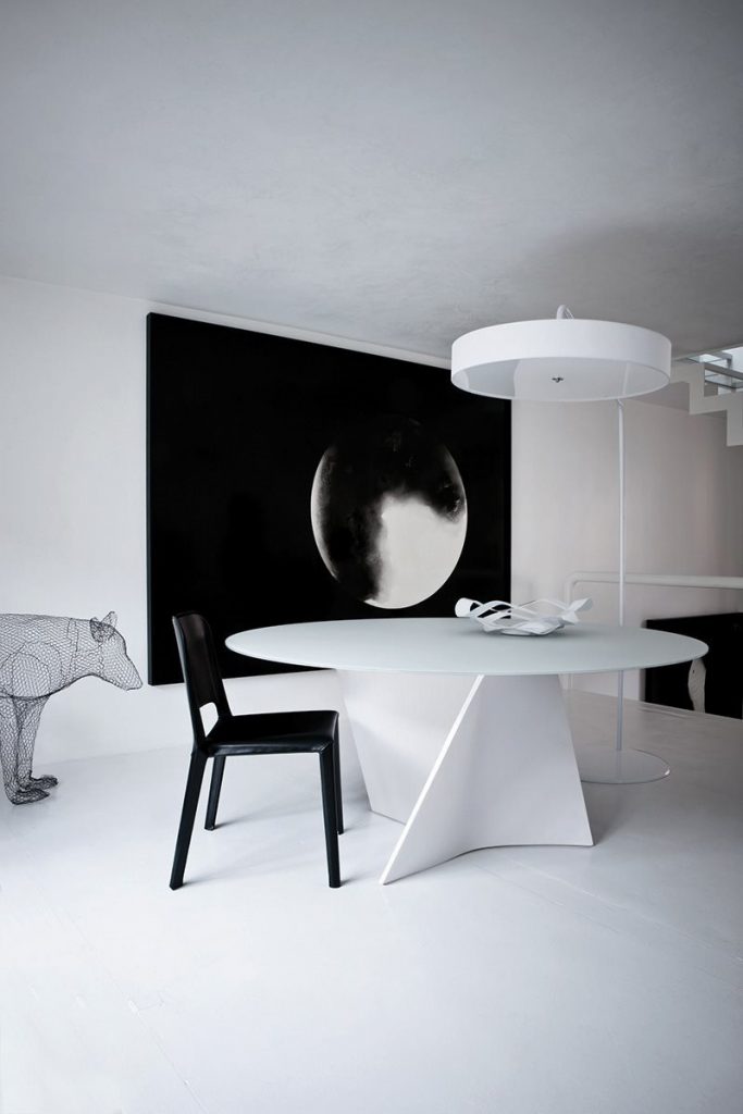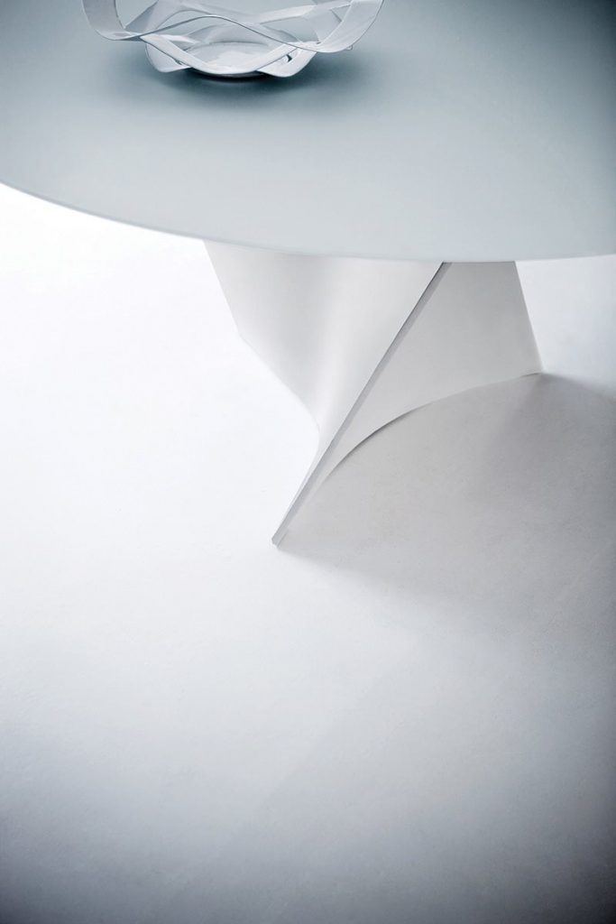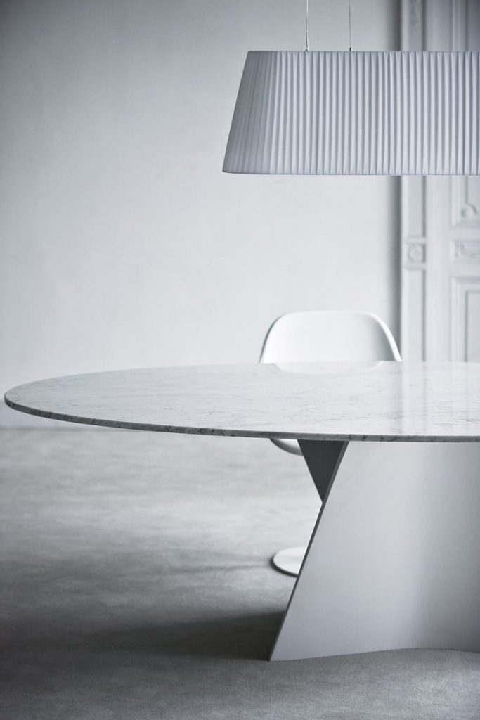 Base in Cristalplant®, composite material based on polyester and acrylic resins, loaded with minerals and mass pigmented. For the version 2575, tempered, extraclear, acidated plate glass top painted in the shade of white or made of white Carrara marble only matching the matt white base; or Sahara Noir marble top, with stain-resistant clear matt polyester protective varnish, matching the matt black varnished base. For the version 2576, clear plate glass top, matching the matt white base or black glossy lacquered; or smoky grey plate glass top only matching the black glossy lacquered base.