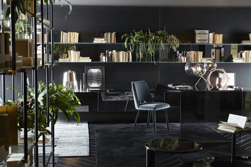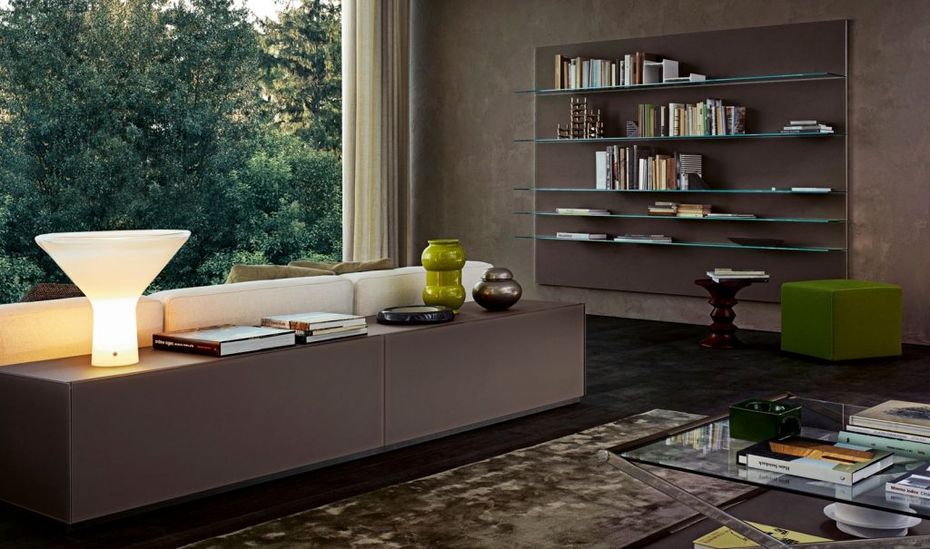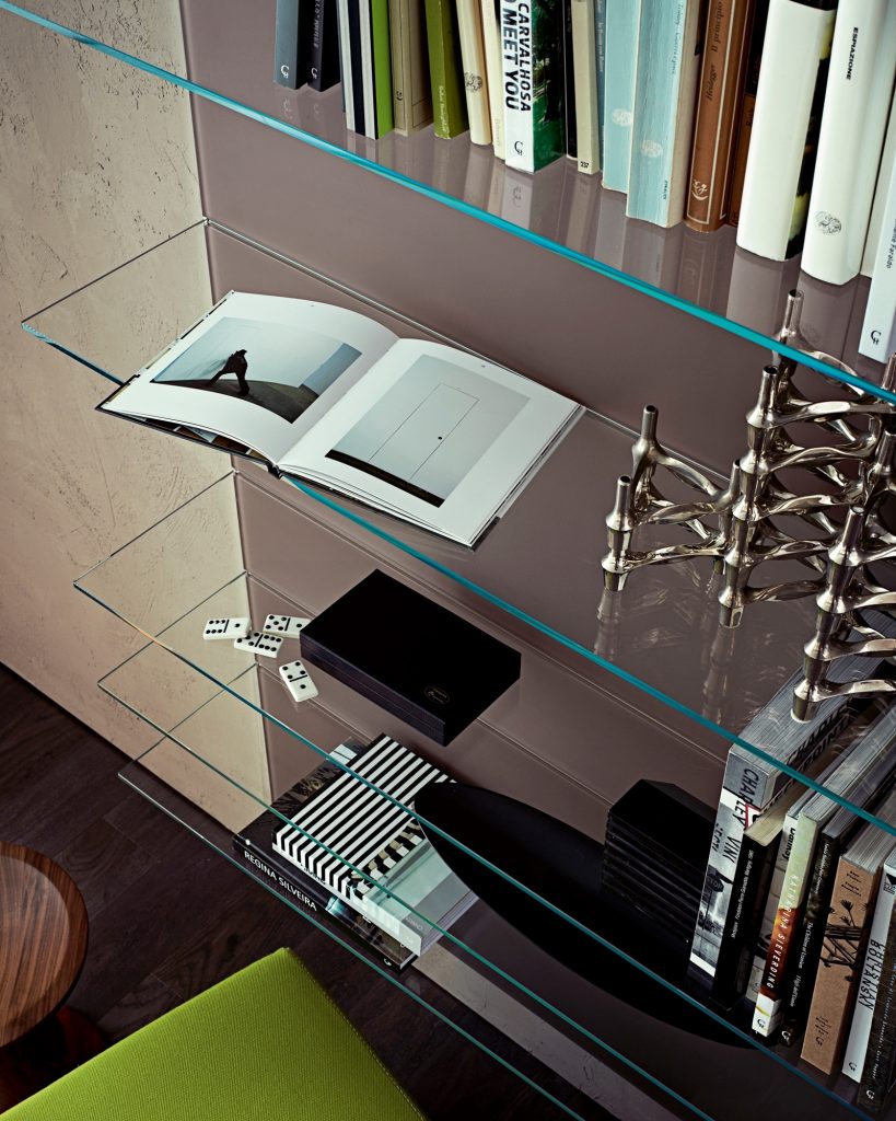 Wooden boiserie covered with extralight mirror or smoked 'grigio Italia' mirror or painted glass as per samples in the bright or satin version. Available also in natural ash, tobacco stained or wengé stained. 8mm extralight transparent glass shelves *. Bright aluminium frame. * Max capacity of the shelf: 25 kg on solid wall