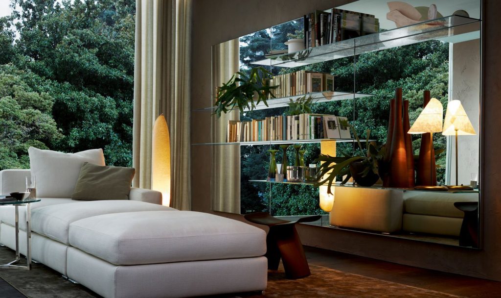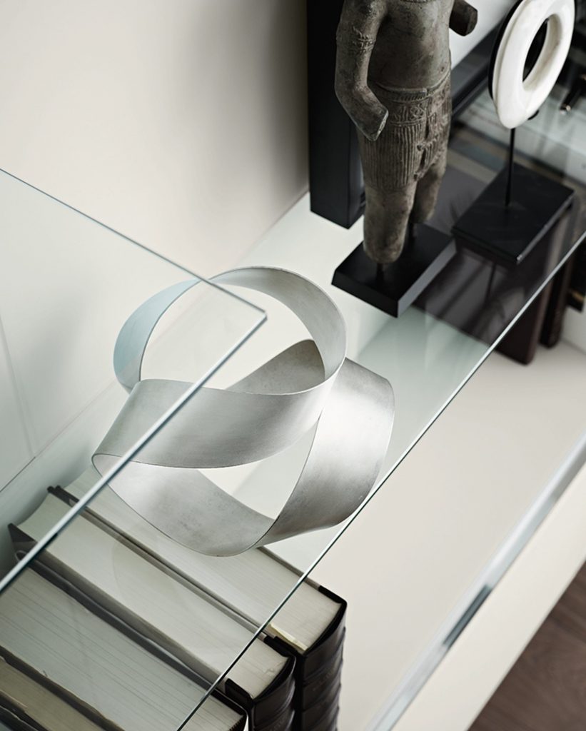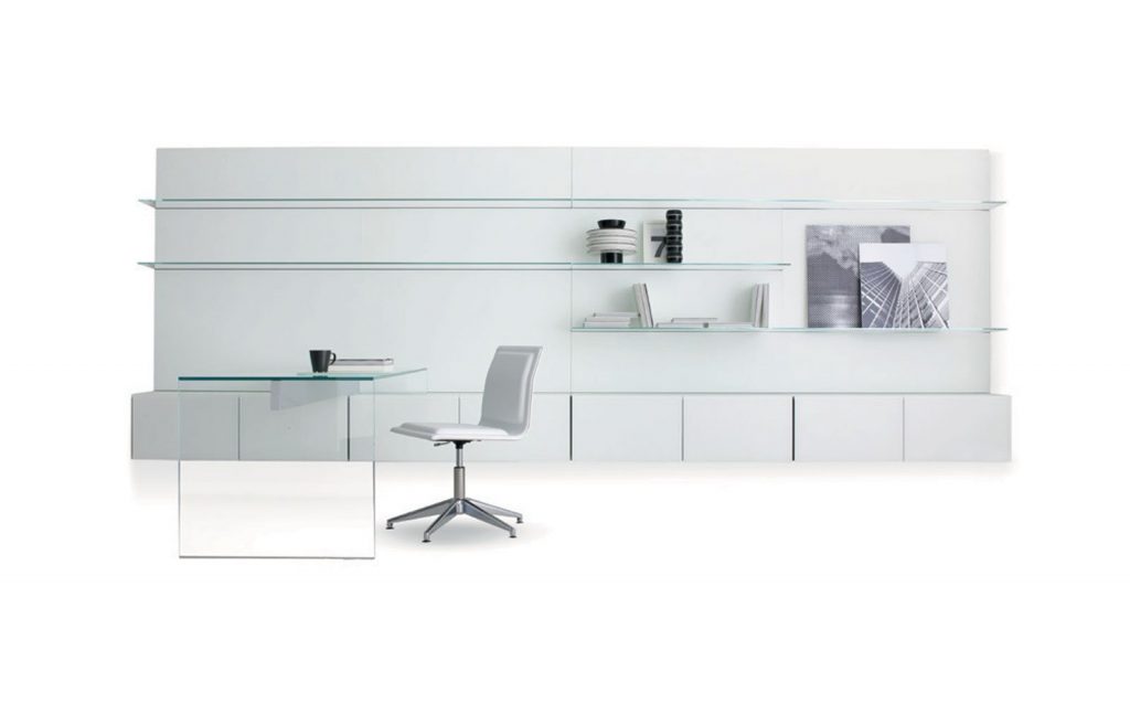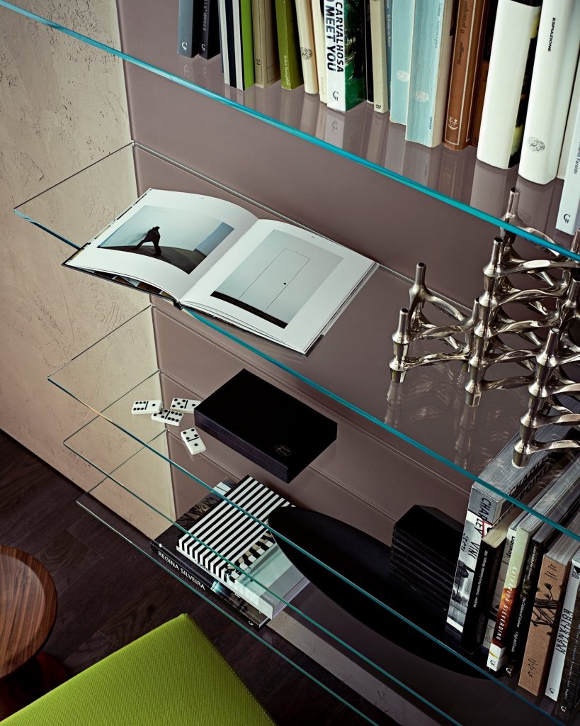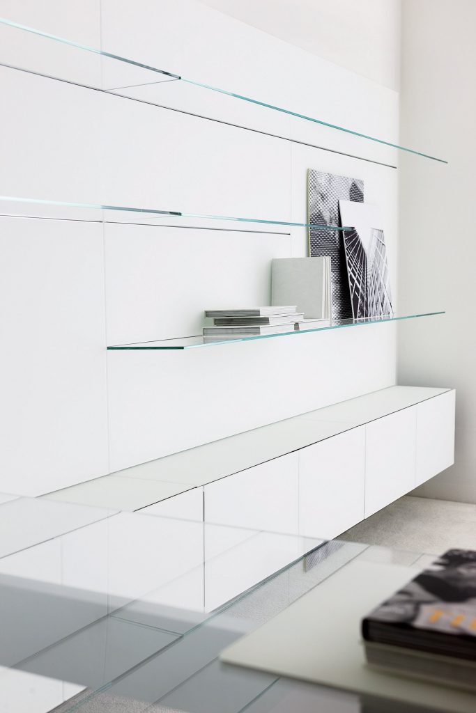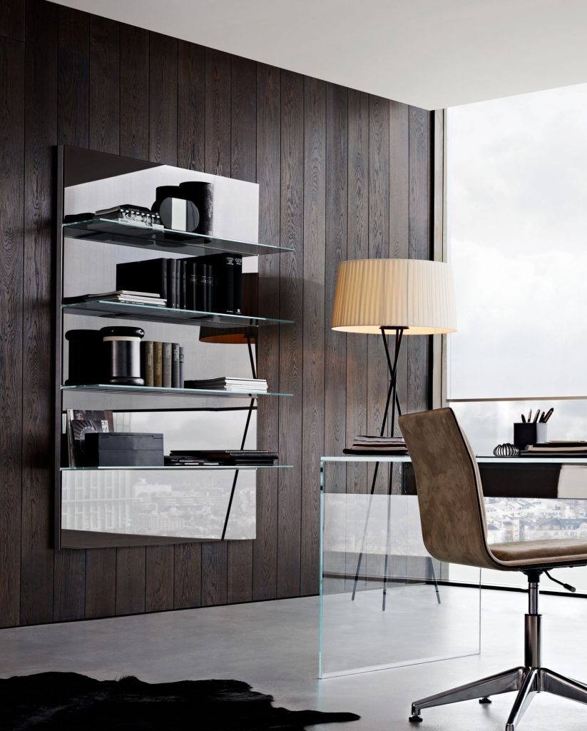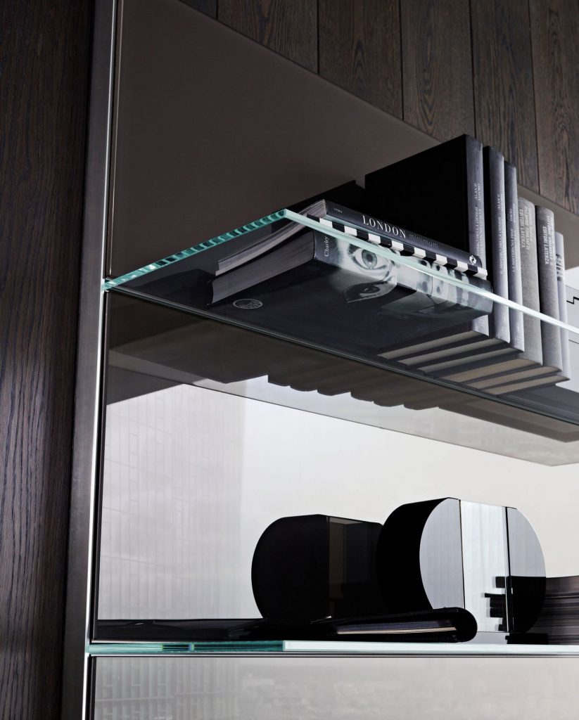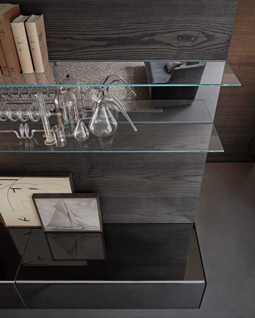 Wooden boiserie covered by extralight mirror or smoked 'grigio Italia' mirror or painted glass as per samples in the bright or satin version. Available also in natural ash, tobacco stained or wengé stained. 8mm extralight transparent glass shelves. Bright aluminium frame.