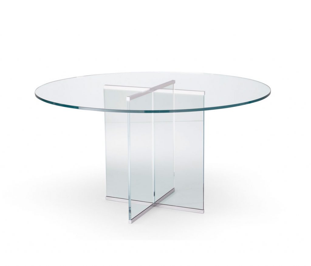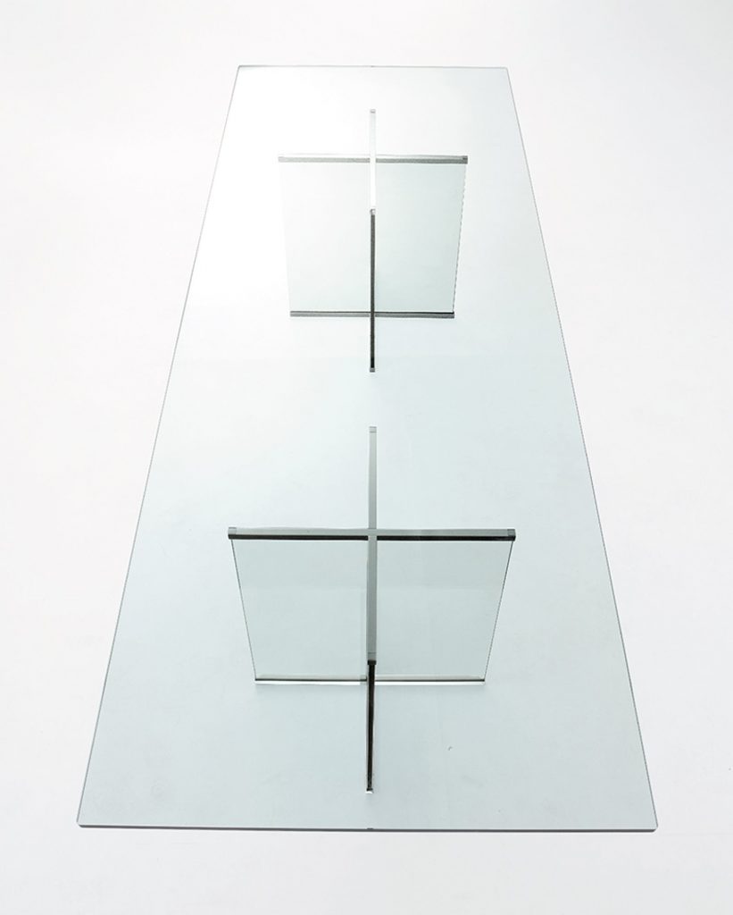 Table in transparent glass. Chromed brass metal parts. 15mm tempered glass base. Customized sizes for the top on request. Available with transparent glass top or transparent extralight glass top. For glass top larger than 240cm, two bases are recommended.