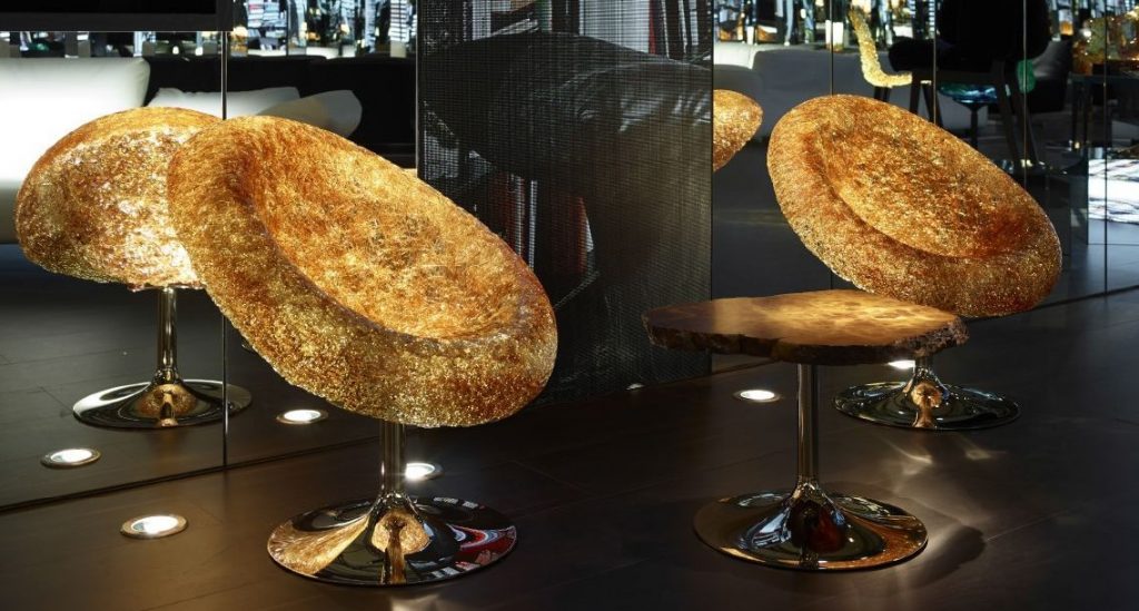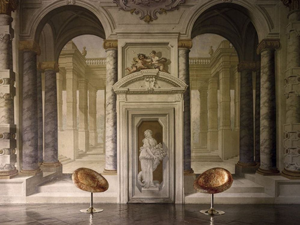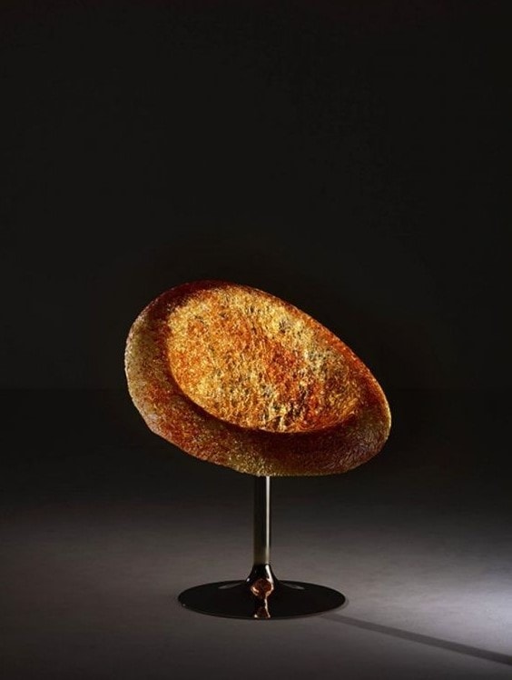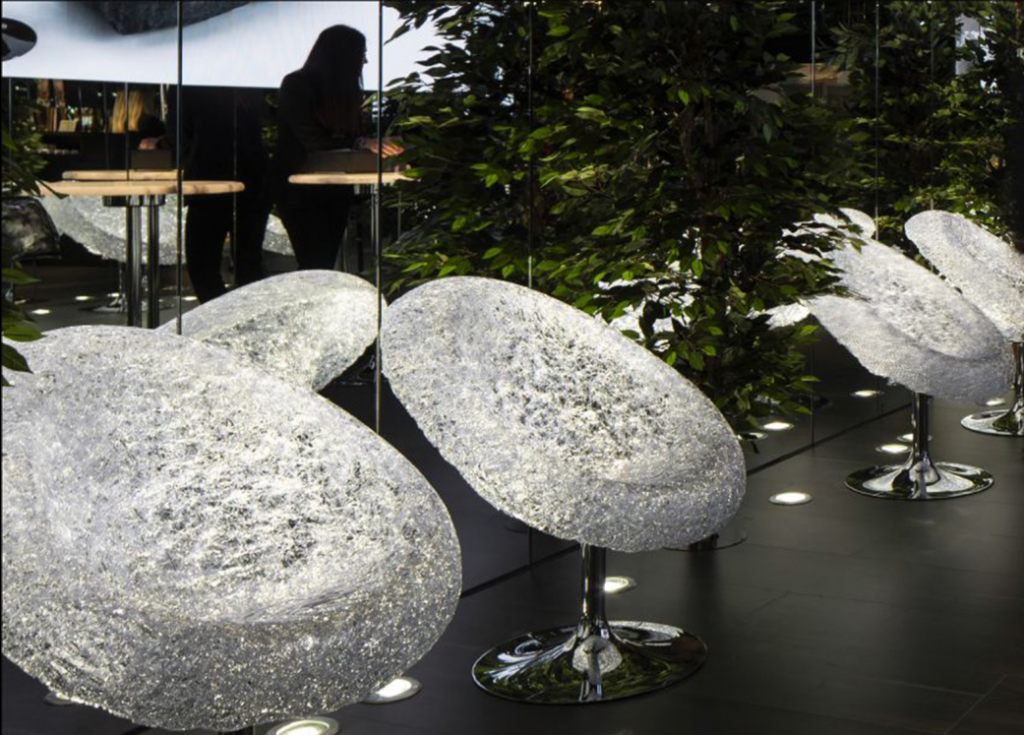 The sensation of being wrapped while your touch feels the pleasantness of the material, whose design is different all the time. A welcoming molded shell with a rotating base.