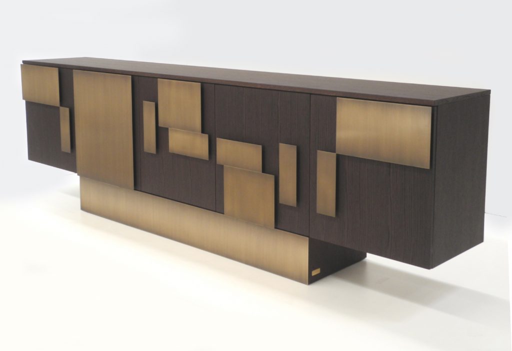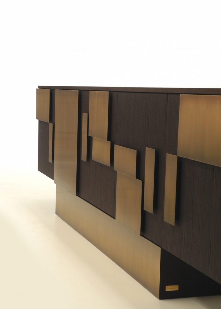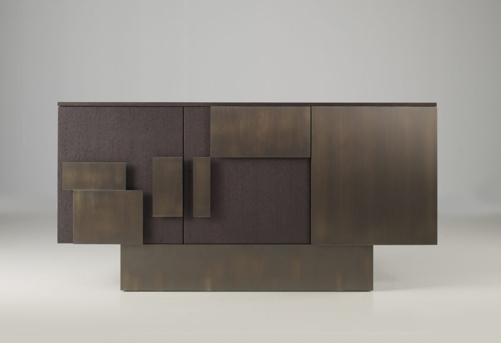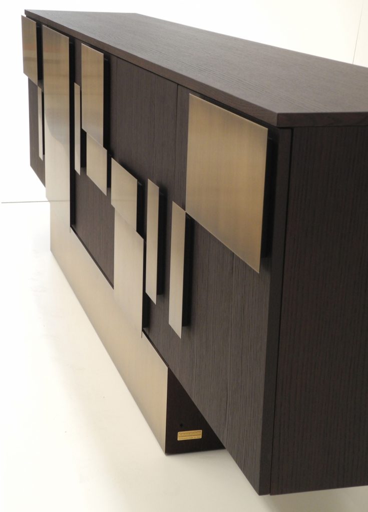 Version of the Evolution sideboard made using only the modern side. Made of veneered multilayer wood, then completely sandblasted. Inner spaces equipped with one wooden shelf each. The handles and the frontal side of the base can be in brass or in steel.