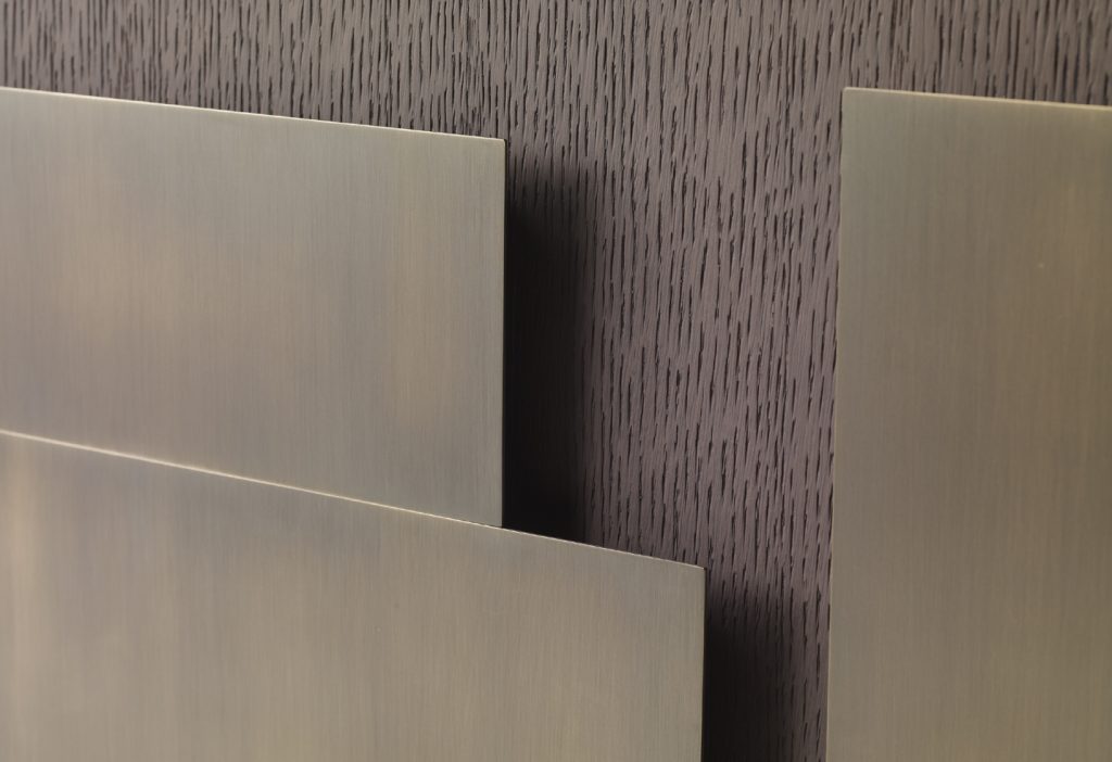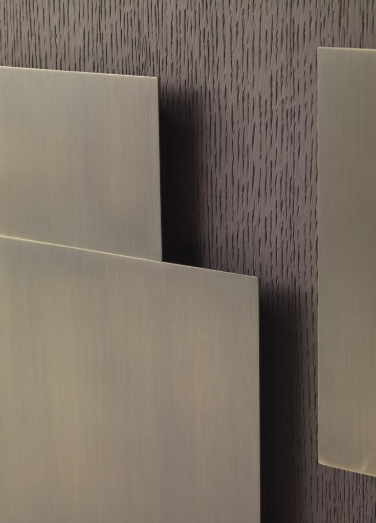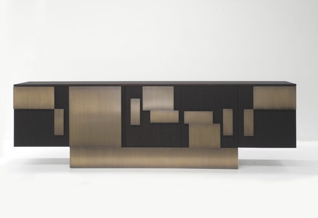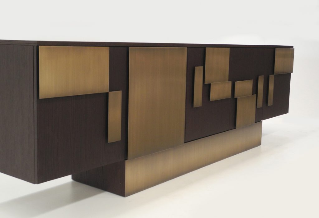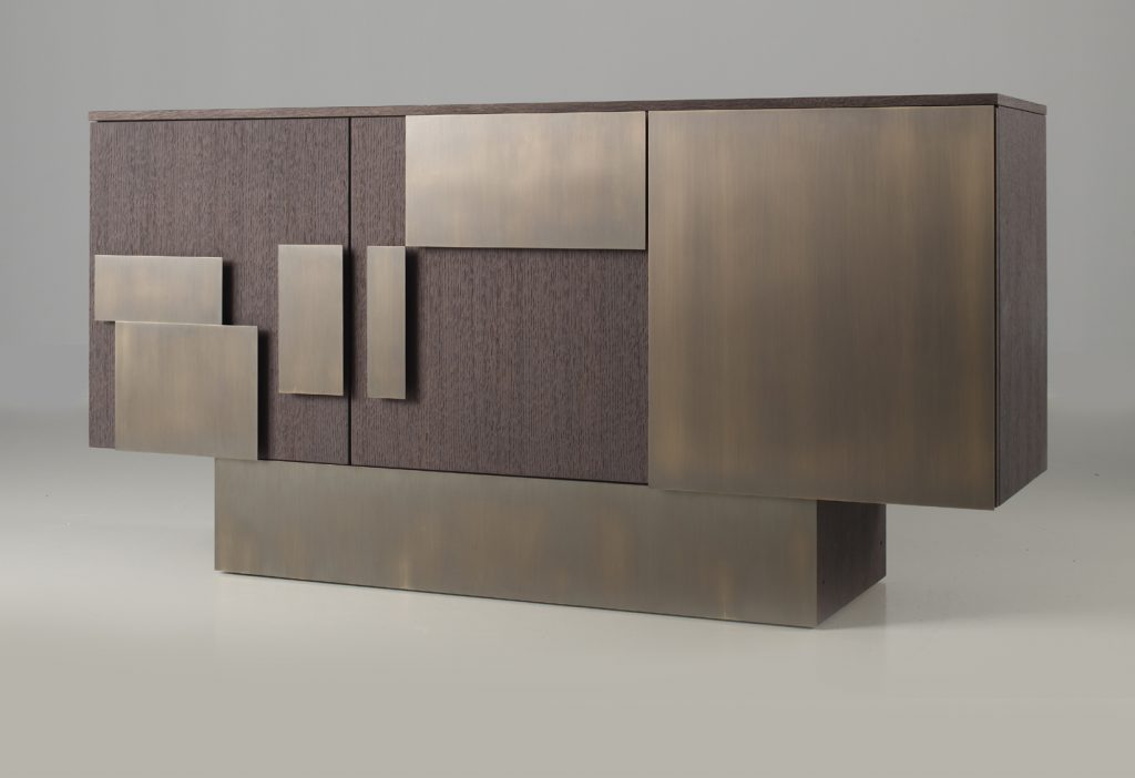 Version of the Evolution sideboard made using only the modern side. Made of veneered multilayer wood, then completely sandblasted. Inner spaces equipped with one wooden shelf each. The handles and the frontal side of the base can be in brass or in steel.