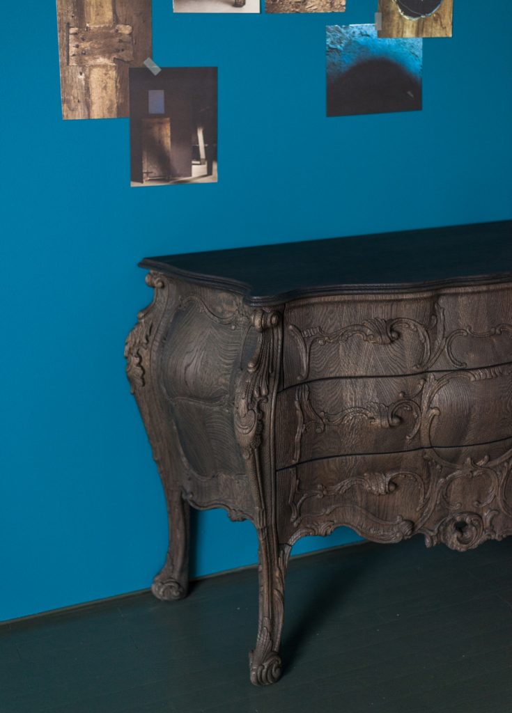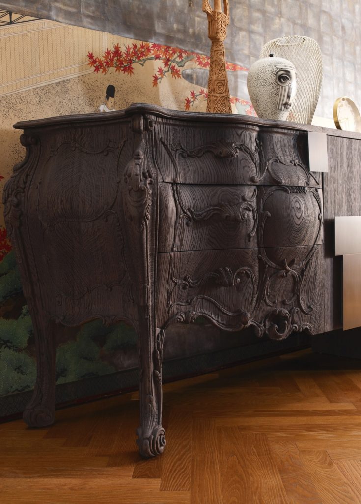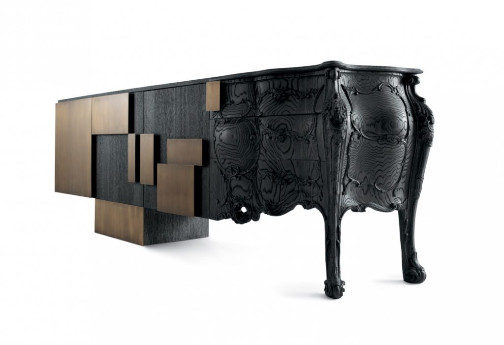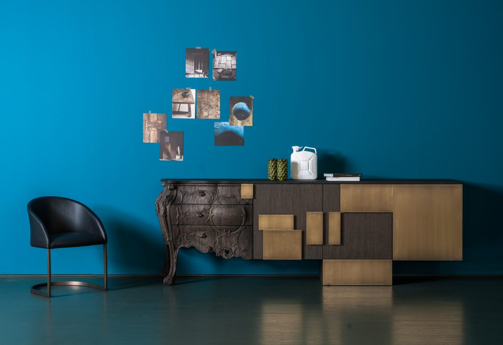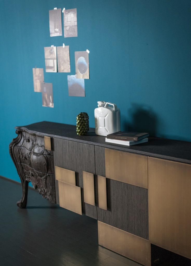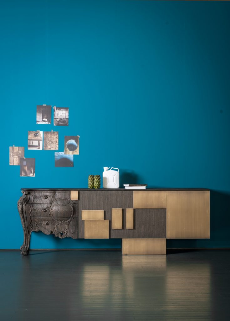 Sideboard made combining old and modern woodcrafts. The classical side is made of blocks of solid wood, vertically placed, and carved by hand. The modern side is, instead, made of veneered multilayer wood. Then, the sideboard is completely sandblasted. The classical side is equipped with 3 drawers with wooden runners, the modern one with one wooden shelf per space. The handles and the frontal side of the base can be in brass or in steel.