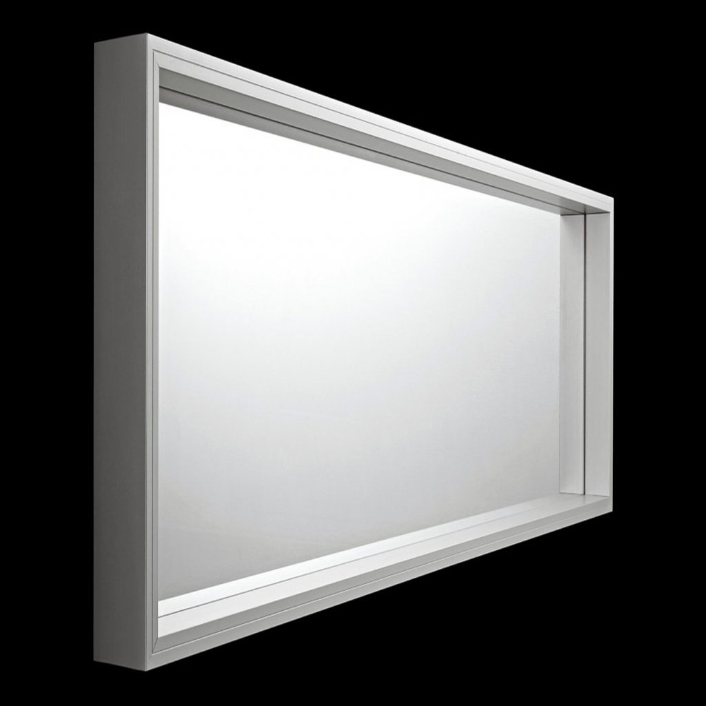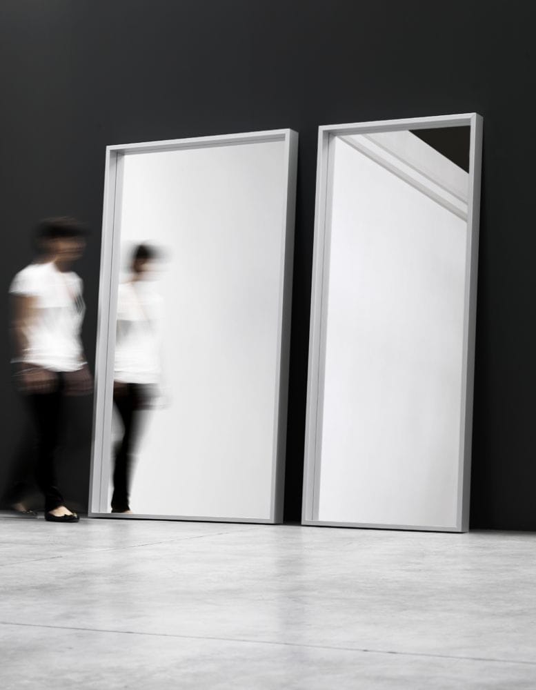 Extra large wall mounted mirror with an anodized aluminum structure.