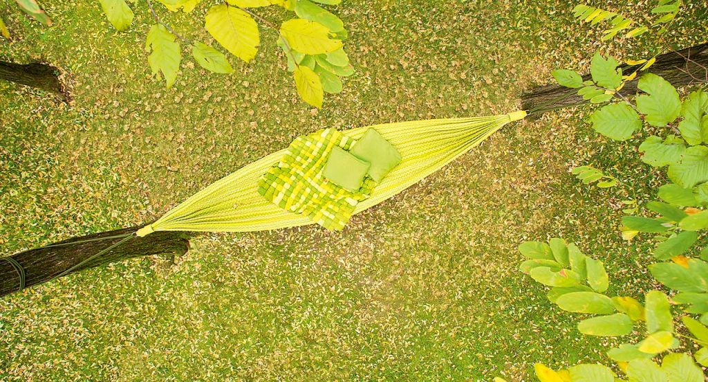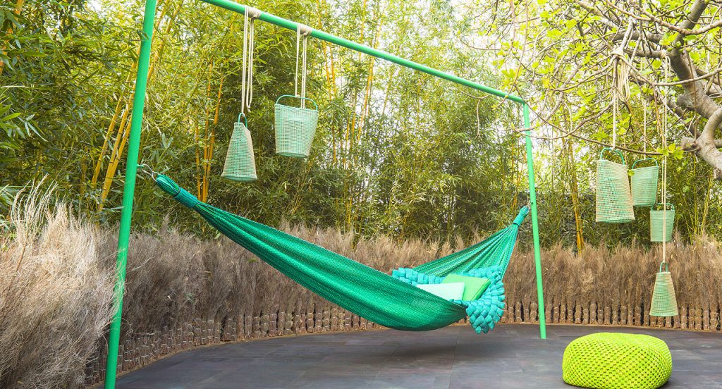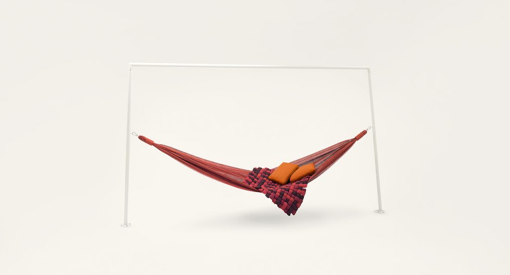 Hammock made of fabric. - Structure: Trame fabric in Rope yarn, fittings in Chain Outdoor tubular knit in colours matching the fabric, hooking system in stainless steel. - Notes: Loose cushions are recommended for enhanced comfort. The hammock Farniente can be hanged to a specific structure made of stainless steel matt varnished in avorio or in grafite, mora, ruggine, sottobosco, oliva or foresta colours or even gloss varnished. The structure is provided with base plates for the fixing to weight bearing surfaces. This product can be used also in interior environments.