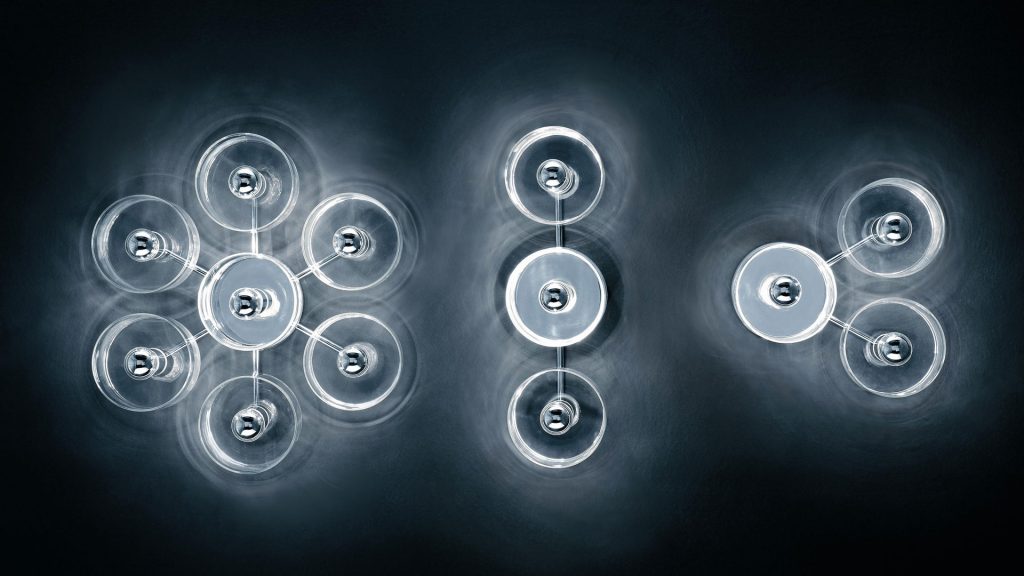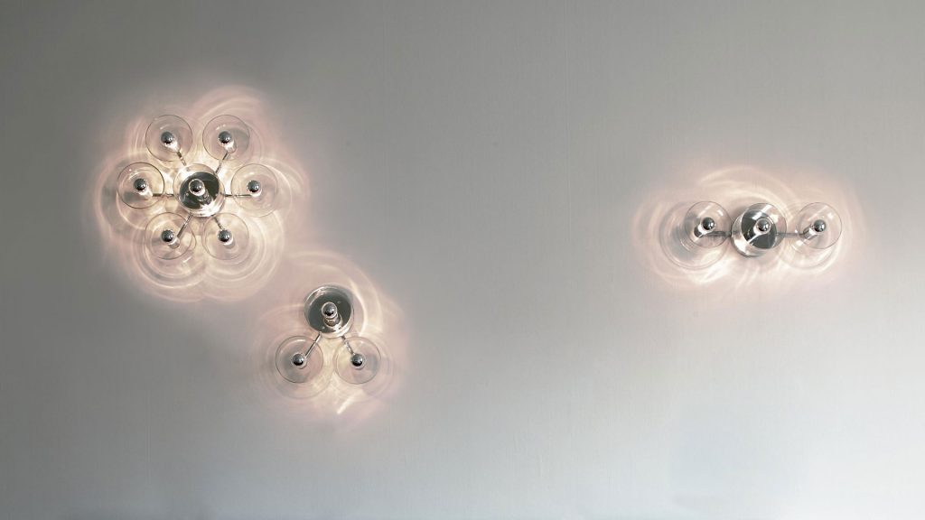 In the wall/ceiling version, Fiore is available with 7 luminaires, 3 luminaires in the linear and triangular variations and with only one luminaire, creating geometric or decorative motifs on the domestic surfaces.