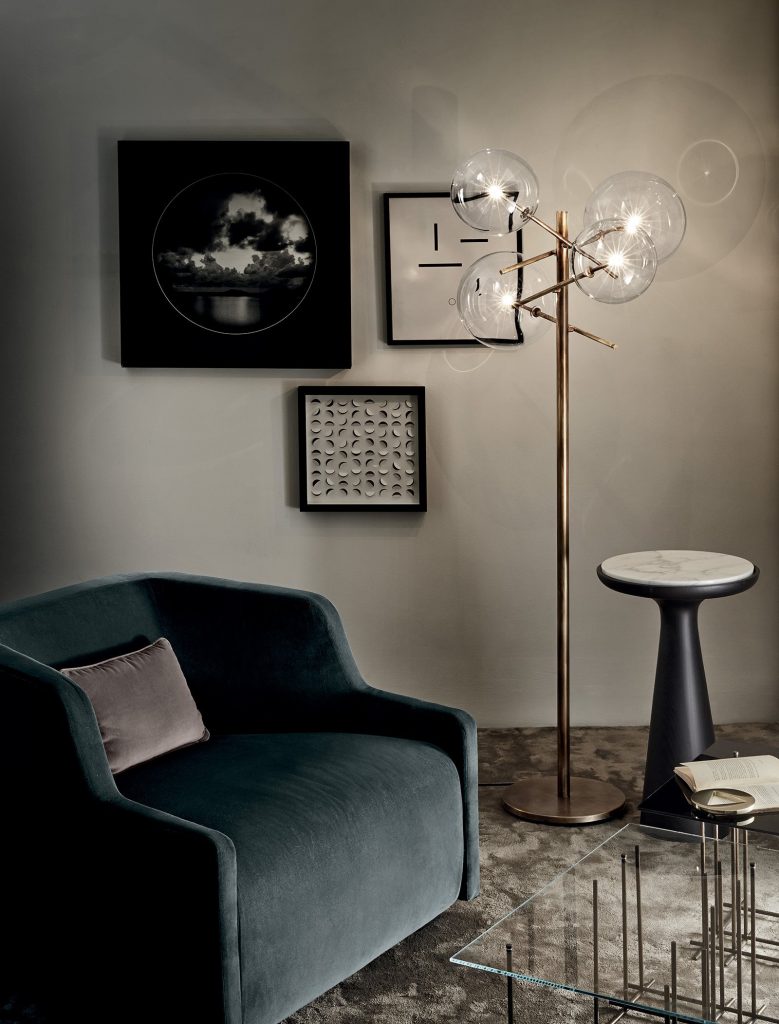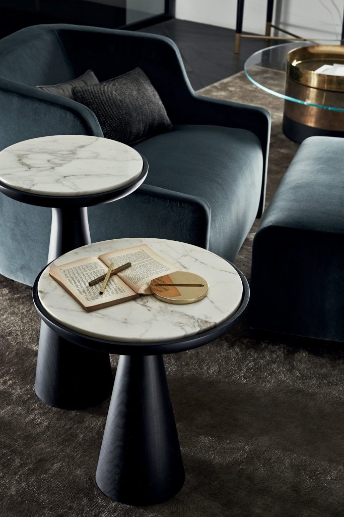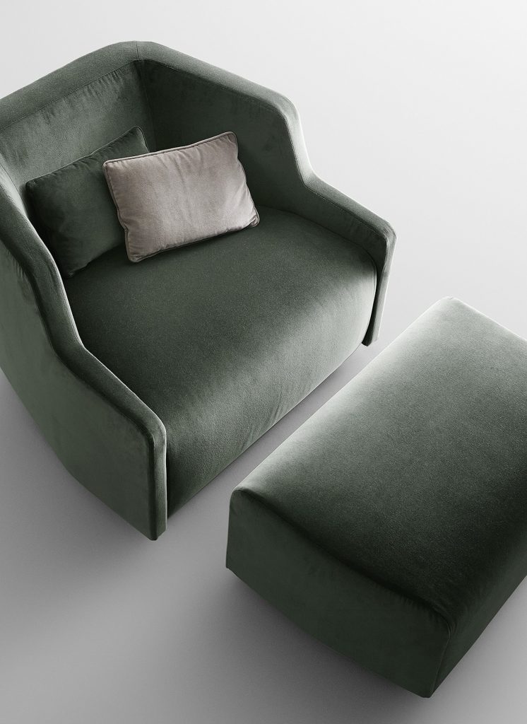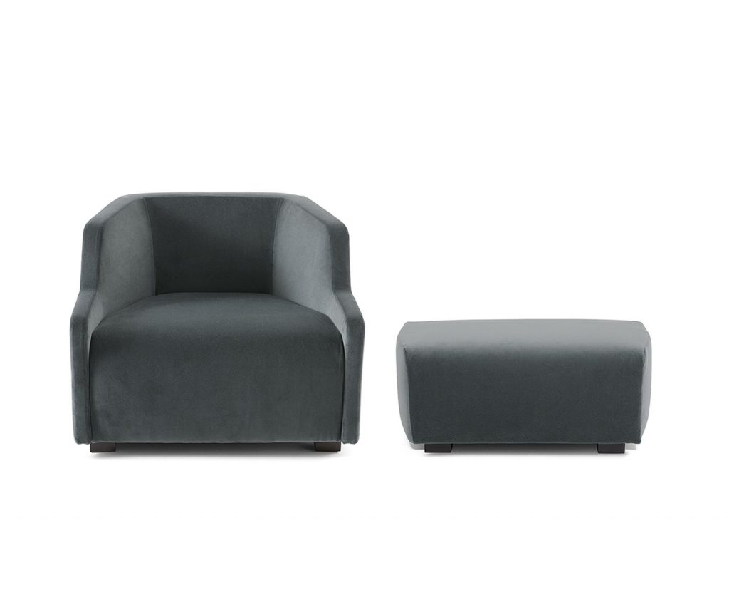 Armchair and pouf in non-deformable foam polyurethane in different density and polyester fibre with wooden inside structure. Black lacquered wooden feet. Available covered by velvet or suede as per samples. Decorative polyester fibre cushions, on request.