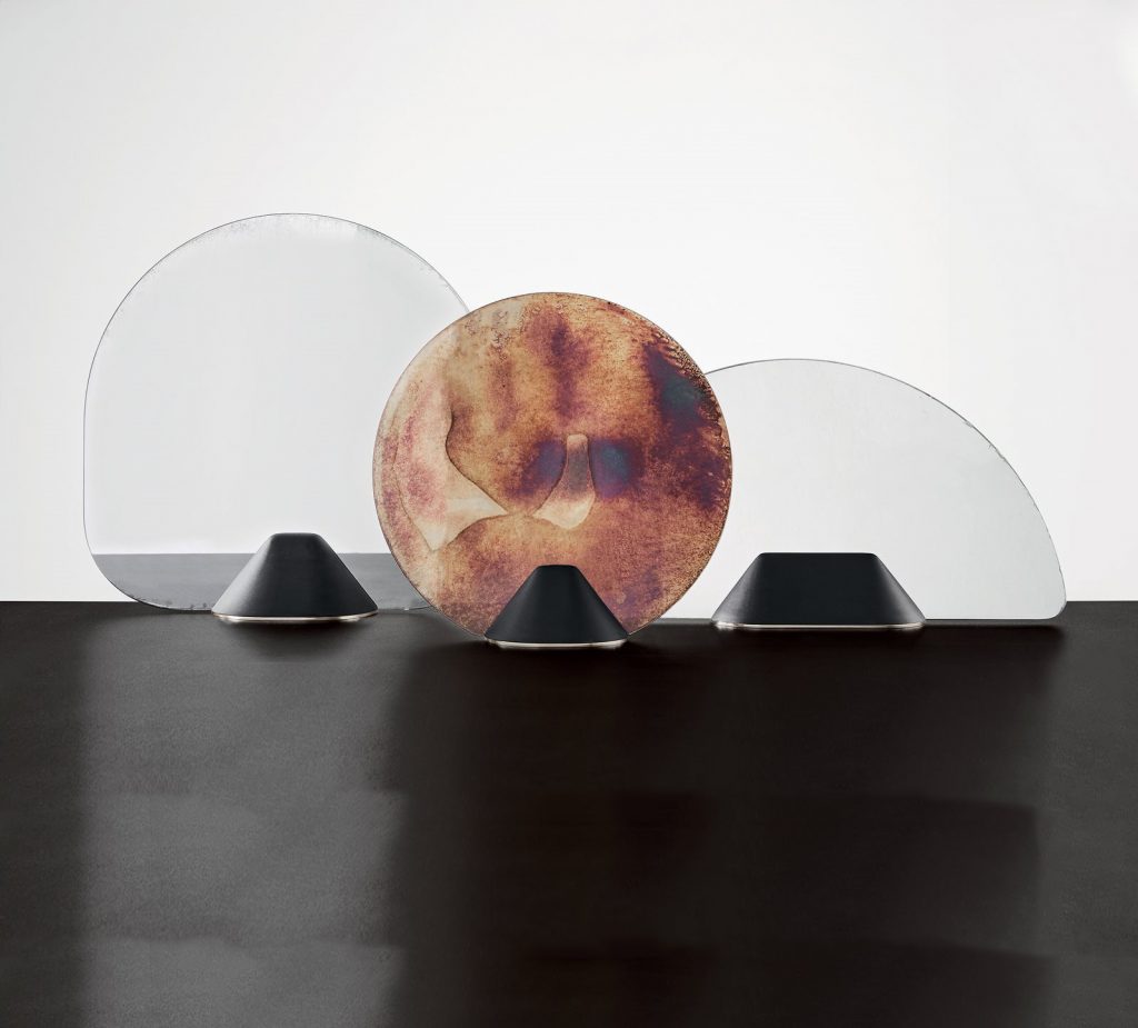 Table mirror. Hand silver-plated and antiqued. Black (mod. Layer) open pore lacquered ash wooden base and bright brass.