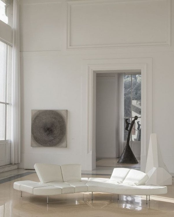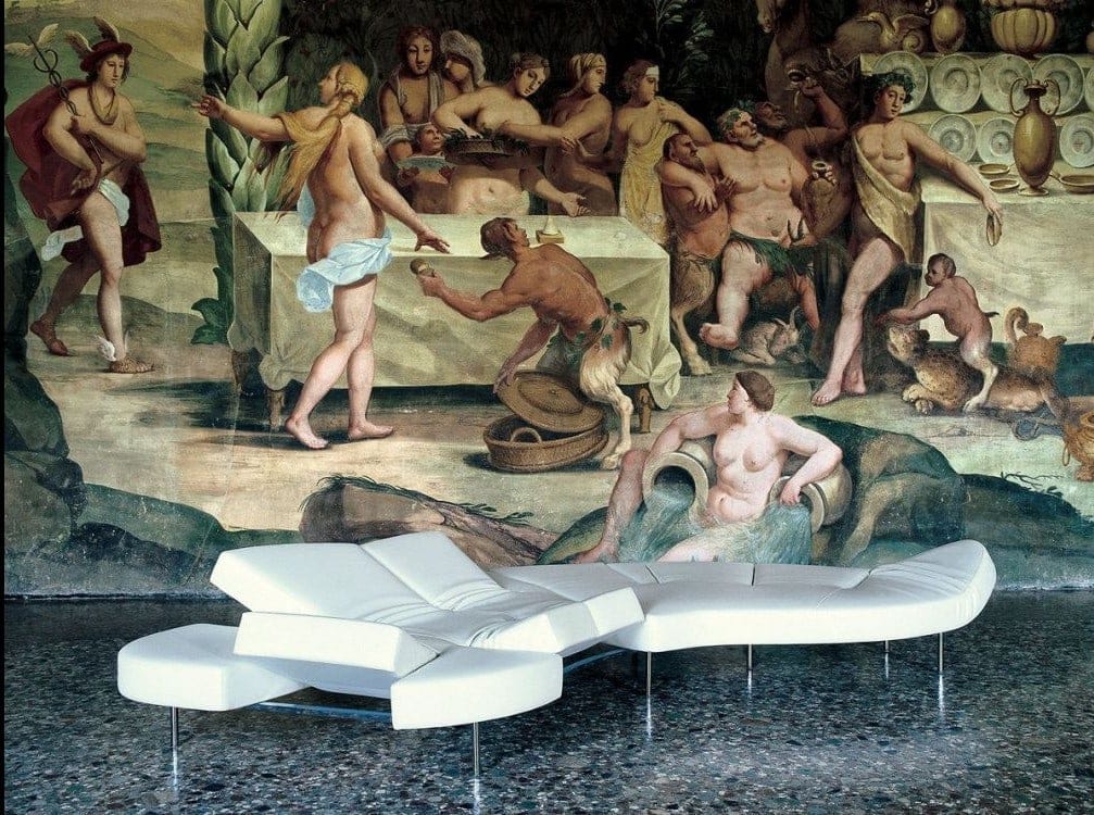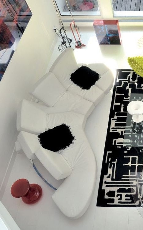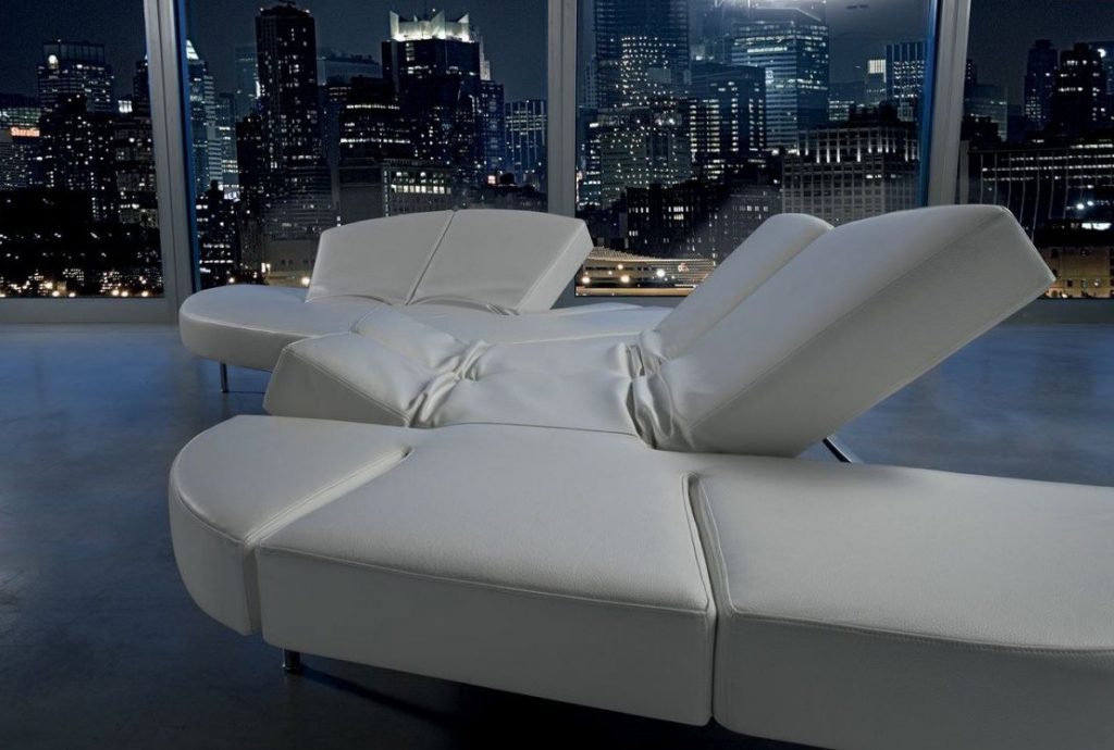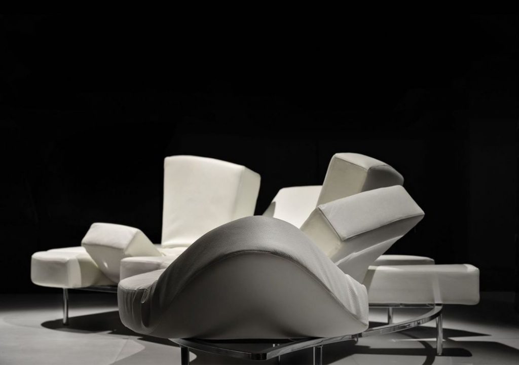 An original typology for a sofa contained in only fourteen centimeters of depth, that renews the traditional concept of sitting, and multiplies performance. The sleek shape of the upholstered base offers nine parts that can each recline at six different angles. Each one can be used at will as backrest, armrest, headrest, seat or footrest. The separate and differentiated inclination of each part enhances their synergy. Versatility that offers new expressions to the concept of relaxation. Anatomical dynamism that evolves to satisfy any desire. Single sofa. Day bed for two. Workspace, when almost completely horizontal. Conversation spot for a group of people. Multi-functionality that allows different uses.