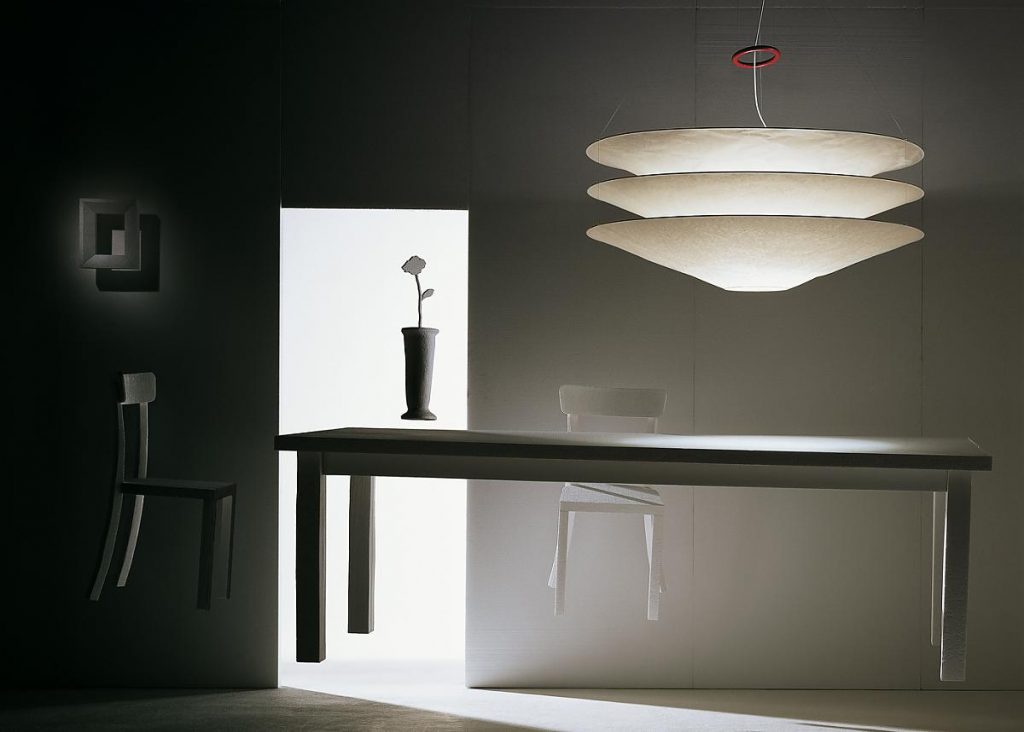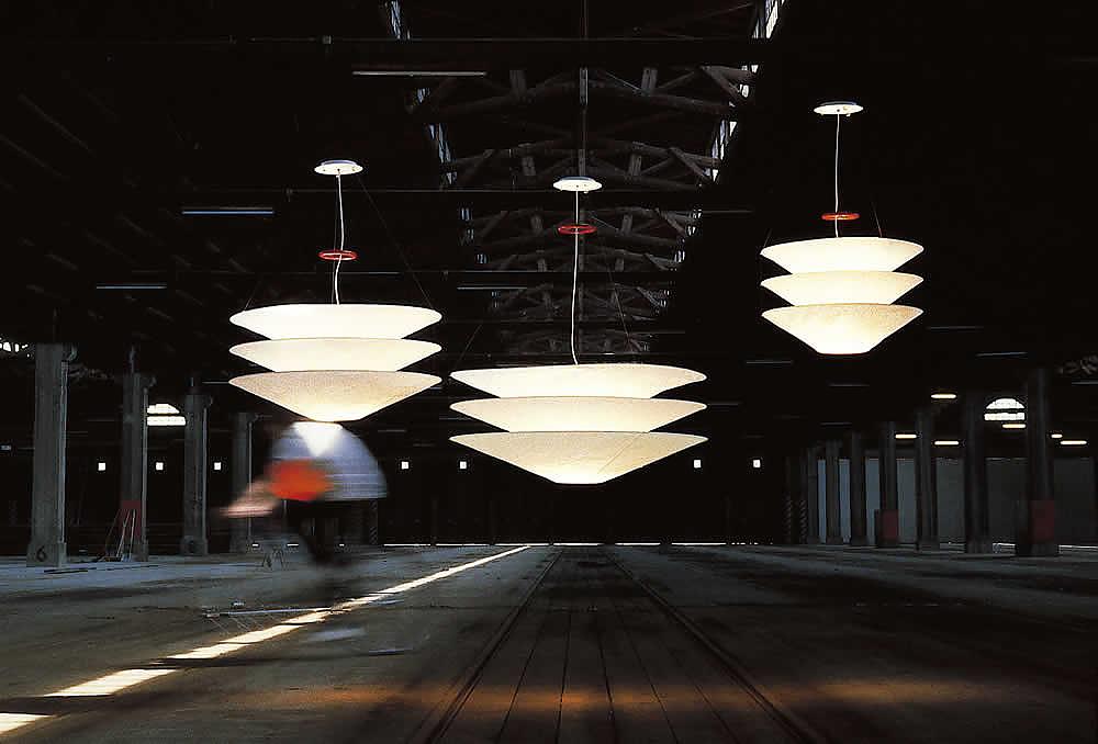 Japanese paper, metal. Height adjustable with red-enamelled iron ring. Metal canopy, white finish