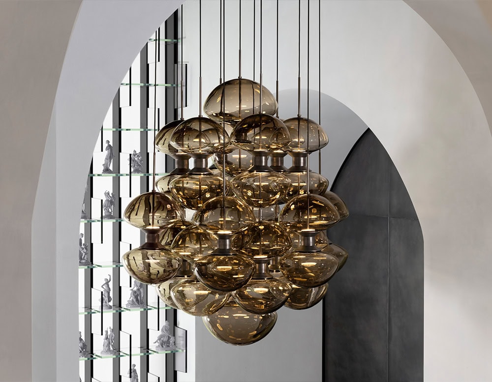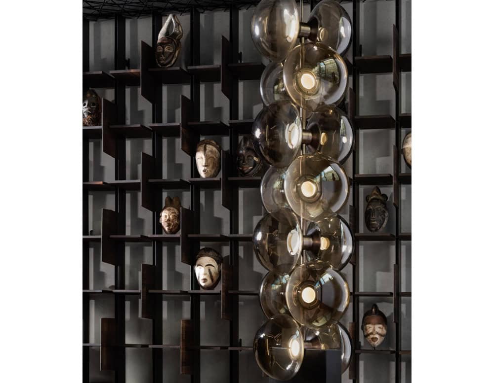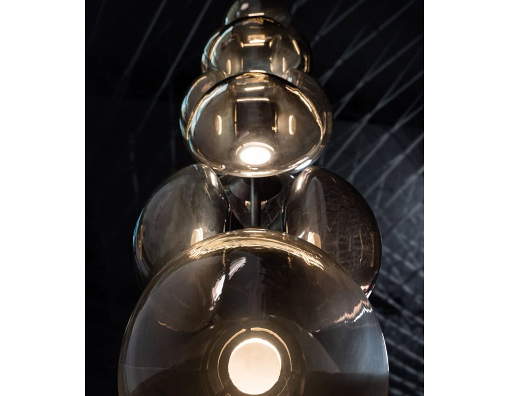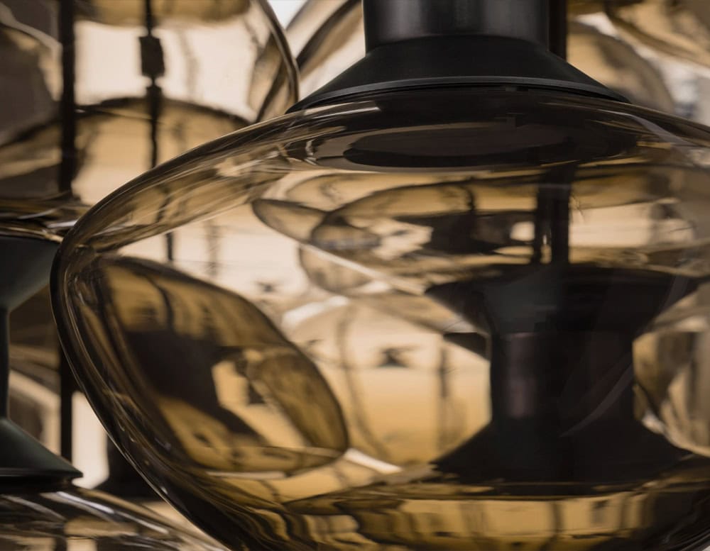 From the dexterity of the historic Veninis master glassmakers blossoms the exquisite, fumè purity of a sinuous shape replicated in double expansion: a fully-fledged artform that amazes with its endless polyhedric versatility.