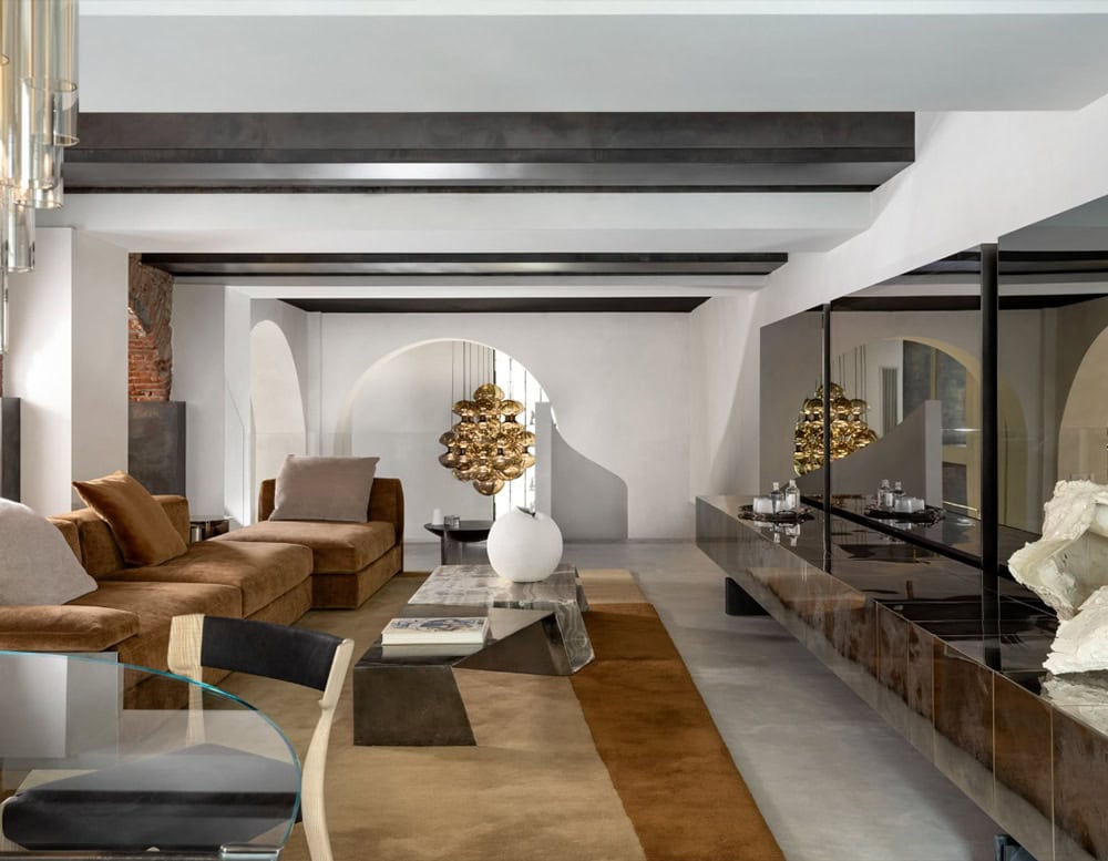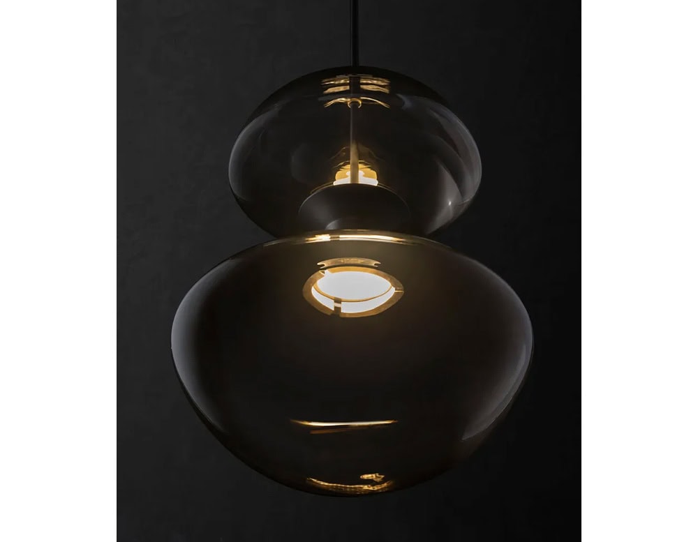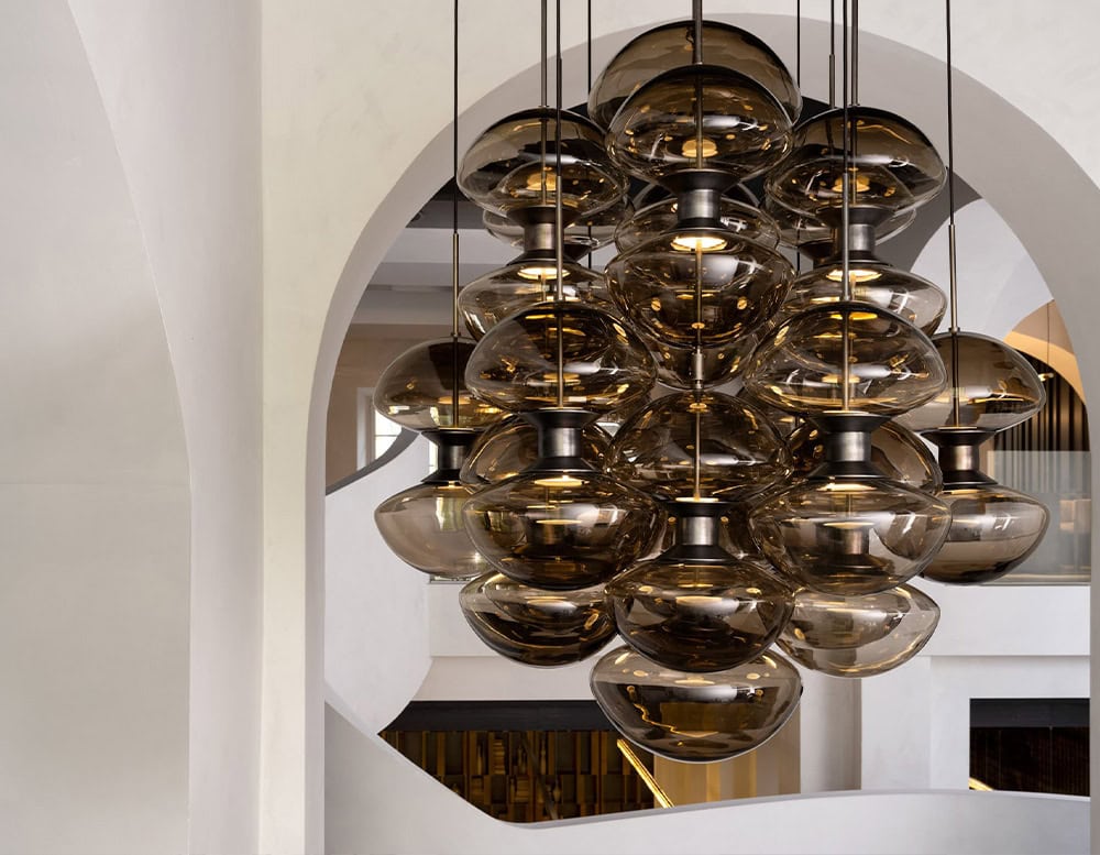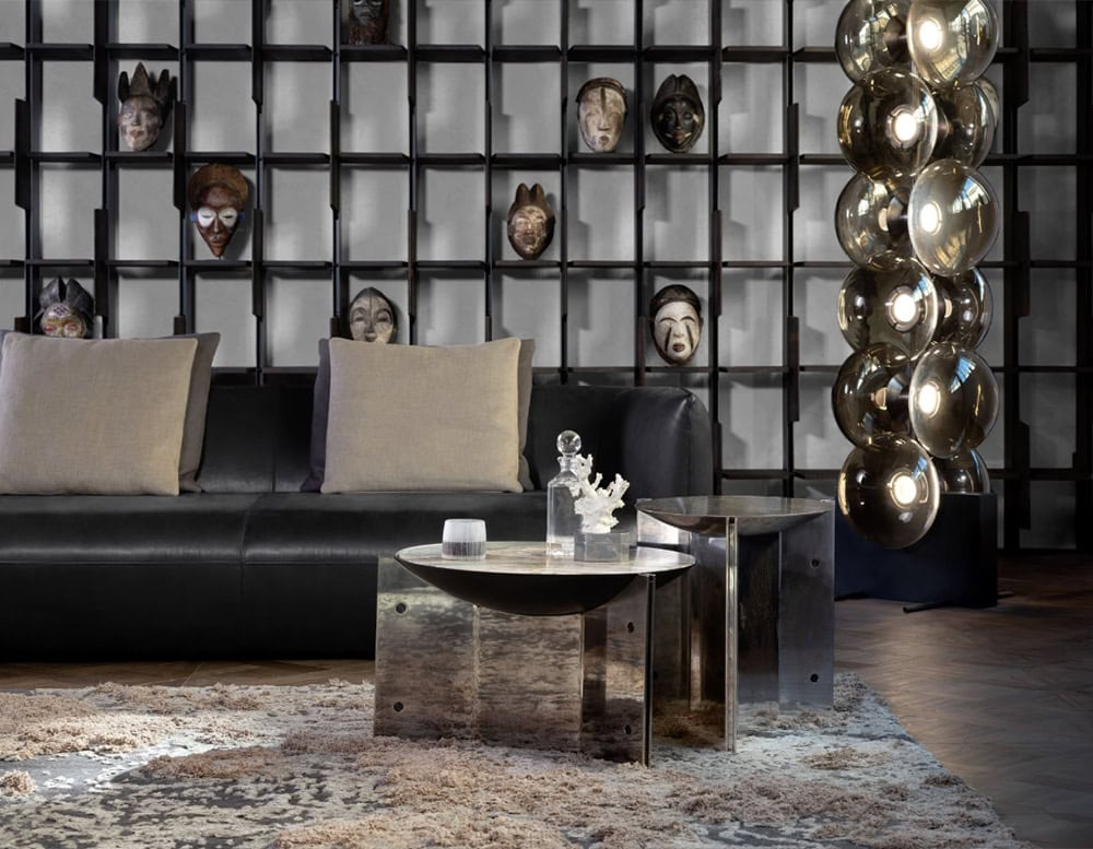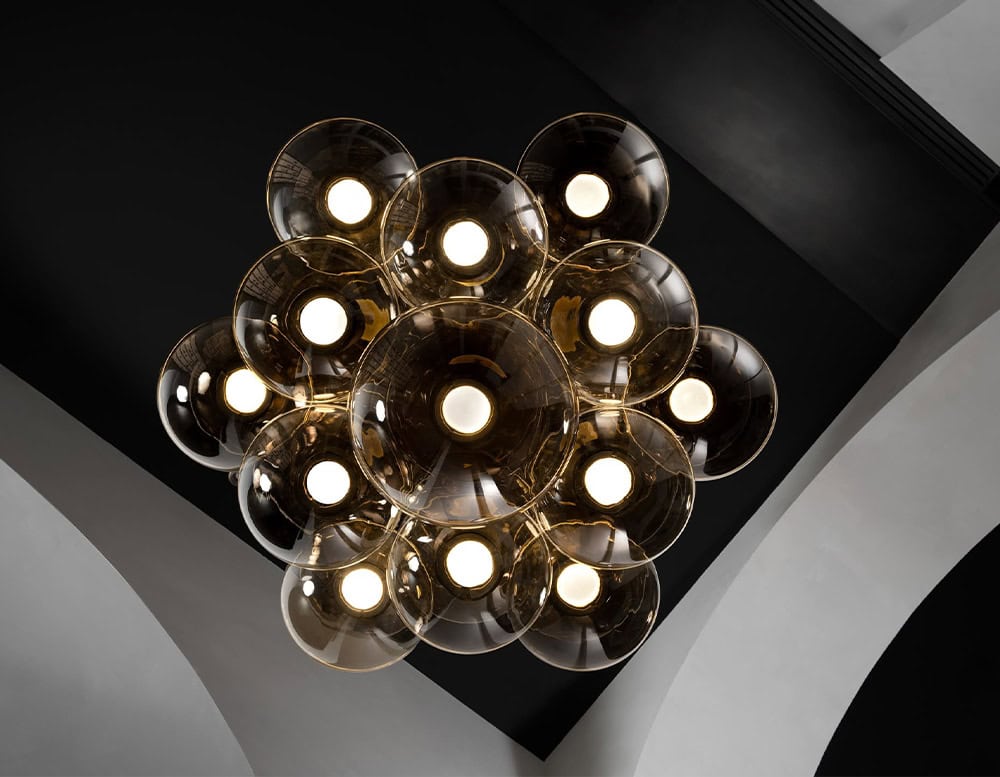 From the dexterity of the historic Veninis master glassmakers blossoms the exquisite, fumè purity of a sinuous shape replicated in double expansion: a fully-fledged artform that amazes with its endless polyhedric versatility.
