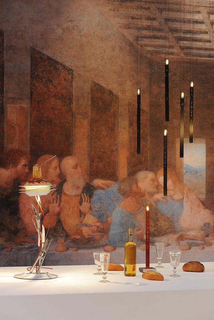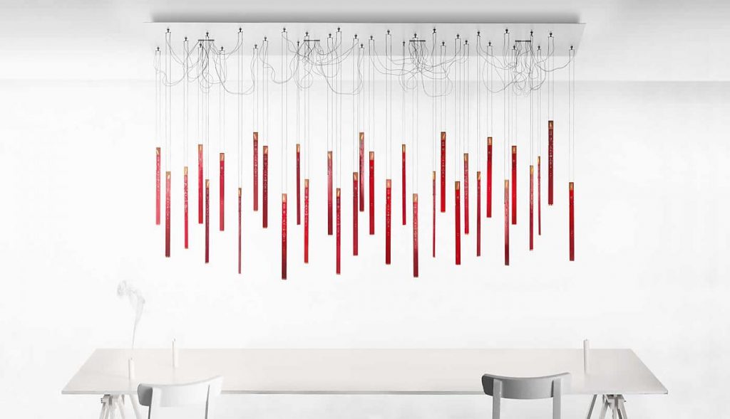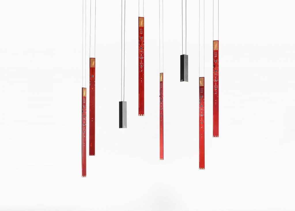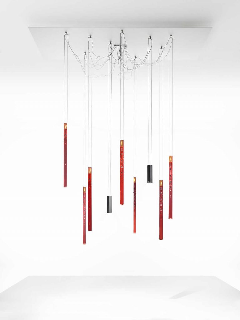 Flying Flames are usually available for immediate delivery. Flying Flames is a new, flexible chandelier system. The magical LED candles, presented by Moritz Waldemeyer and Ingo Maurer in 2012, are combined with simple and functional Downlight Elements. Both elements are placed freely with a magnet on the canopy board. The canopy board comes in two sizes. Flying Flames is designed to permit individual versions of a chandelier. You decide on the number of Flames and their colour. Add up to three downlights for a pleasant light on a table below the chandelier. Choose between the rectangular for the smaller, square canopy, or place multiple canopy boards in a line to create a long chandelier. Place the elements as you choose, and adjust their height. Material: Circuit board, metal, anodised aluminium, plastic.