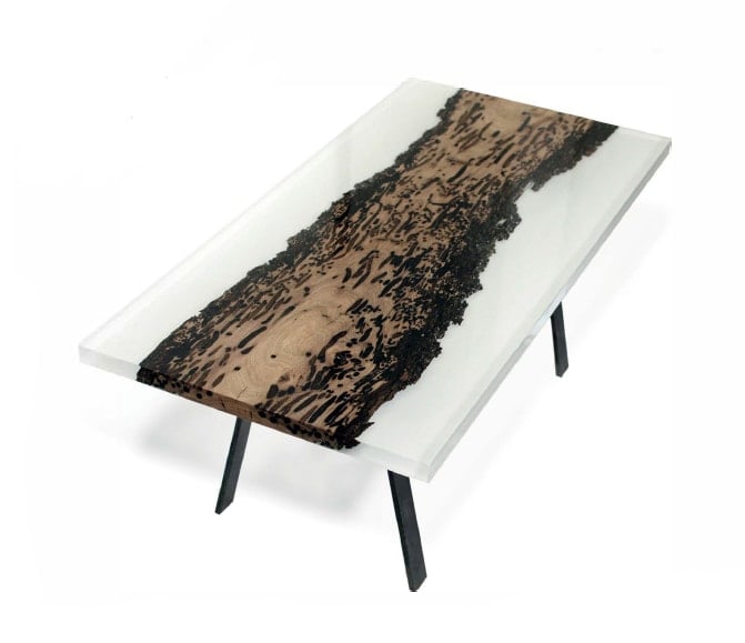 According to alcarol's idea of environmental cross-section, the pieces of Bricola Collection re-use and gives new life to Oak poles recovered in the Venice Lagoon. During the years in the canals, these poles are subjected to unremitting labour of lagoon molluscs and atmospheric agents that carve and sculpt the wood, so that each piece is unique. Using a patented and elaborated resination process, alcarol preserves intact the natural and peculiar live edges, filling the gaps and capturing the underwater air bubbles that bring the wood back to the original look and conditions. At the same time, the natural wood surface on the section planes is not not covered by resin, in order to guarantee a different experience of touch and sight, and to give their essential characteristics: warmth and matt porosity from natural wood, elegance and evocative transparency from the resin.