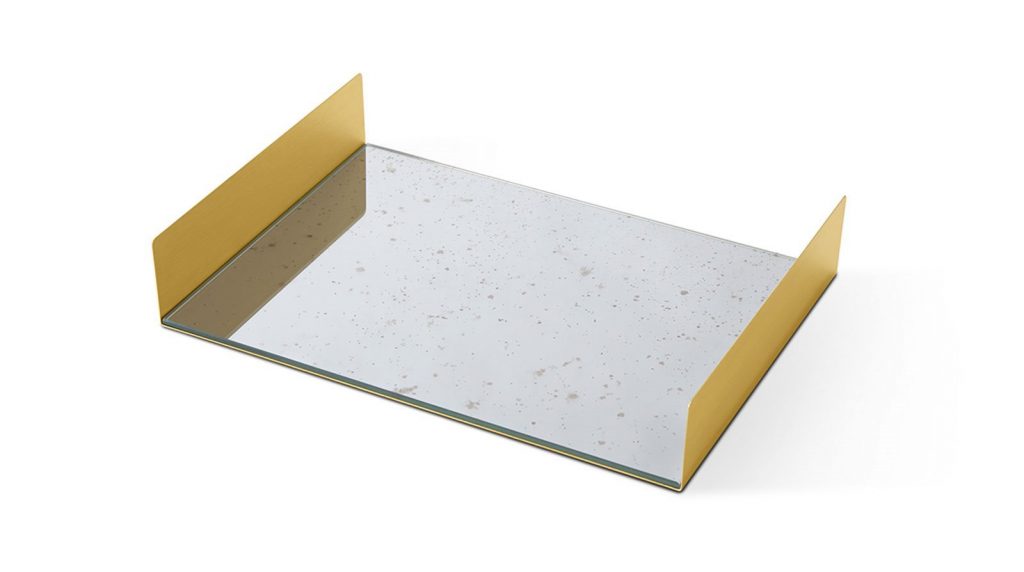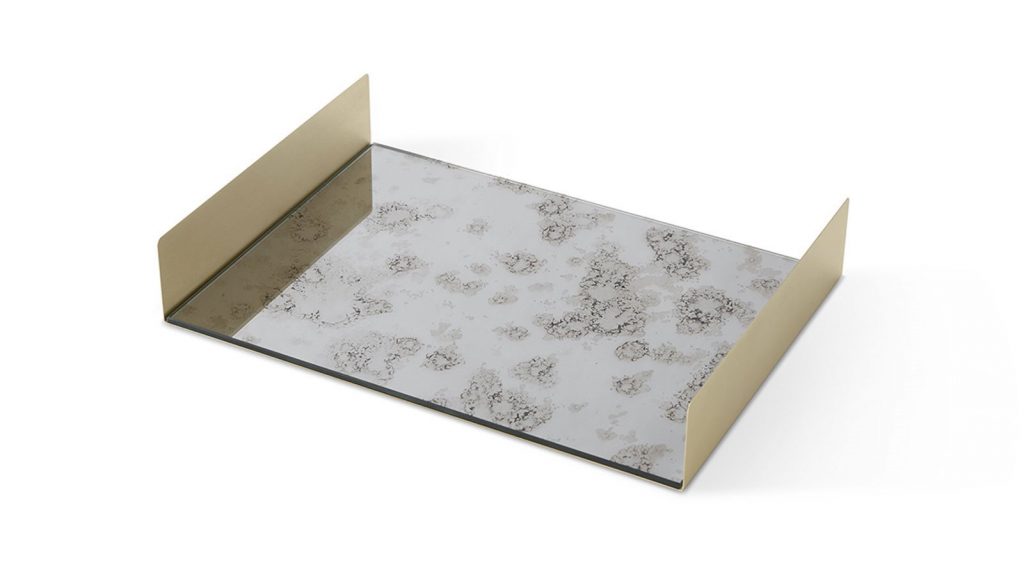 Tray in satinated brass and antiqued mirror or decorated glass. Available also in satined silver-plated brass.