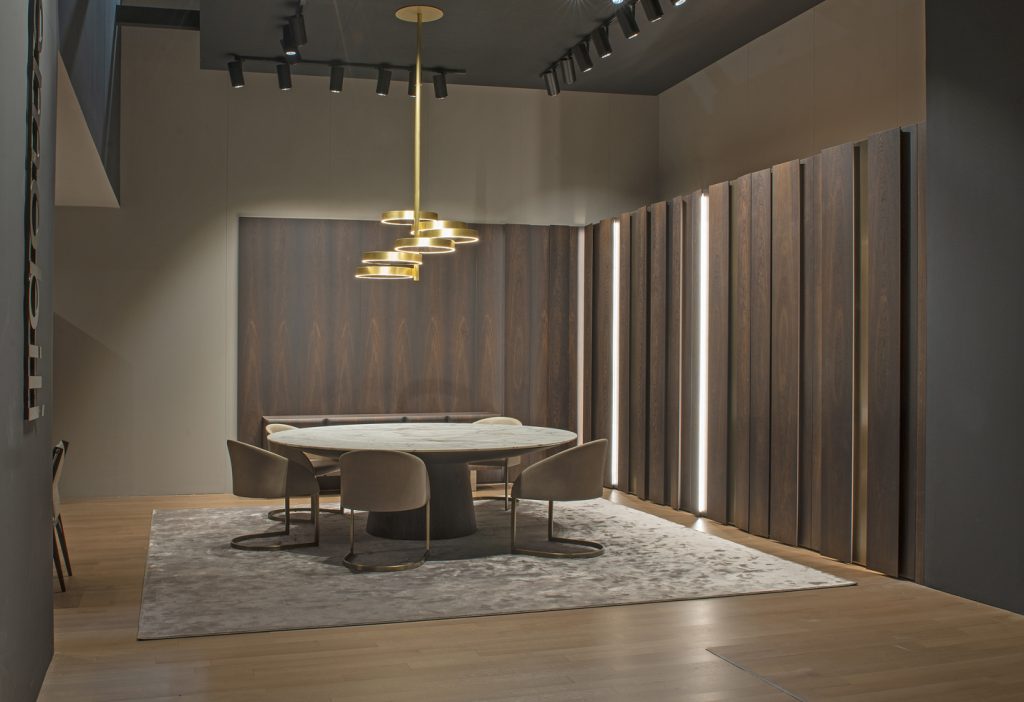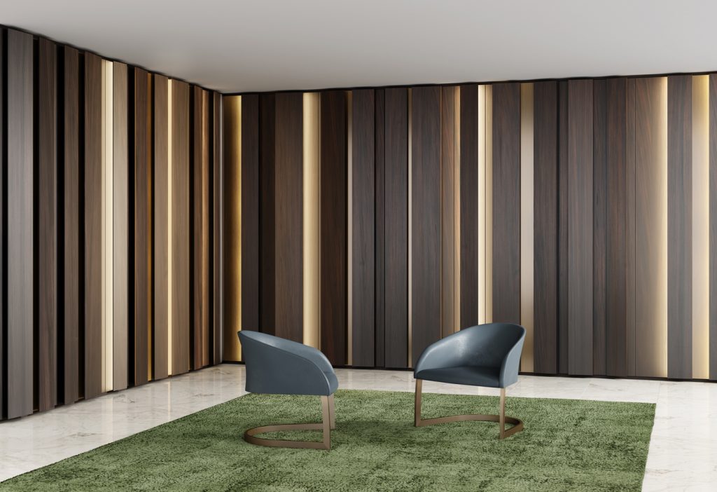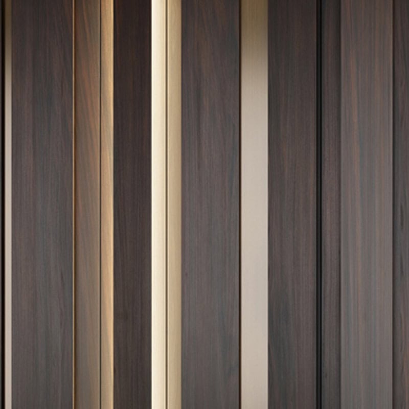 Fractal Boiserie is a system of panels 90xH.270 cm. features the recurrence of linear elements, shaped in their section, made of veneered multilayer wood. In order to enrich the design, possibility to insert brass panels and LED lights. Upon request, we provide a counterframe in multilayer wood to be wall-fixed, on which the decorative panels are hanged. With the counterframe a cavity space is created, useful for the cables' passage and the wall ventilation, and also for an easy removing in case of maintenance.