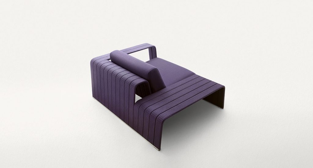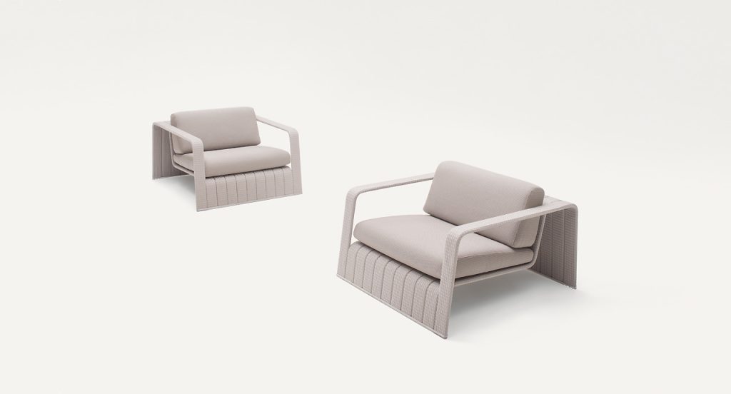 Armchair. The series Frame also includes chairs, chaises longues, platforms, benches, side tables and modular elements. - Structure: aluminium sections. Visible parts in stainless steel, plastic spacers. - Fixed upholstery: - Rope braids in solid colours, in two-colours combinations or in mélange colours. - Aquatech braids in solid colours - Twiggy braids in mélange colours. - Seat pad: expanded polyurethane with polyester covering. A Flex seat pad is also available. - Loose cushion: padding in polyester fiber with water repellent polyester cover. - Seat pad and cushion upholstery: available in Luz, Rope T, Brio or Thea fabric. Notes: This product can be used also in interior environments.We advise to use a Winter Set protection cover.