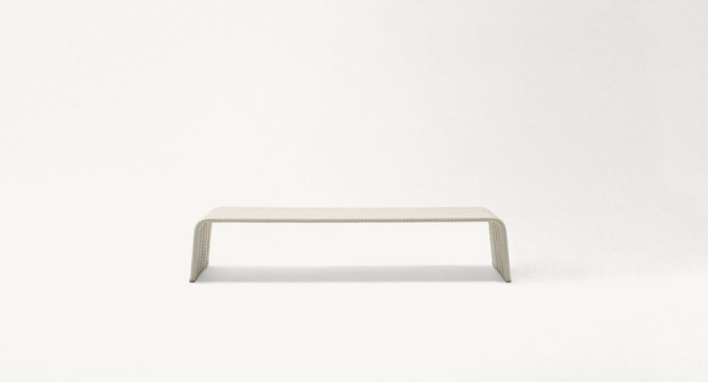 Side tables and benches. The series Frame also includes a chair, armchairs, chaise longue, platforms, and modular elements. - Structure: aluminum sections. Visible parts in stainless steel, plastic spacers. - Fixed upholstery: - Rope braids in solid colours, in two-colours combinations or in mélange colours - Aquatech braids in solid colours - Twiggy braids in mélange colours. - Notes: Some of the Frame side tables can be used also in compositions created with elements of the series Welcome. This product can be used also in interior environments. We advise to use a Winter Set protection cover.