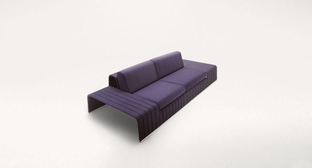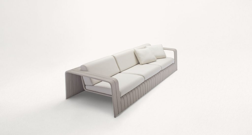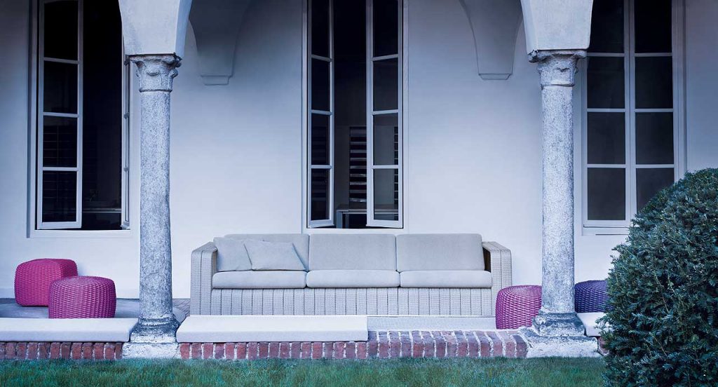 Modular sofas. The series Frame also includes chair, platforms, chaise longues, benches and side tables. - Structure: aluminum sections. Visible parts in stainless steel, plastic spacers. - Coupling system: stainless steel. - Fixed upholstery: - Rope braids in solid colours, in two-colours combinations or in mélange colours - Aquatech braids in solid colours - Twiggy braids in mélange colours. - Seat and back cushions: removable and with removable cover, available for indoor and for outdoor. - Seat and back cushions upholstery cover: removable and available in Luz, Rope T, Brio or Thea fabric. - Notes: This product can be used also in interior environments. We advise to use a Winter Set protection cover.