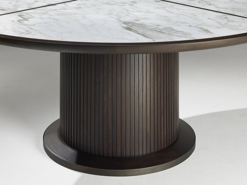 Table made in solid American walnut and veneered poplar plywood. Base covered with solid American walnut wood strips. Base-frame in burnished brass. Top in marble or wood.