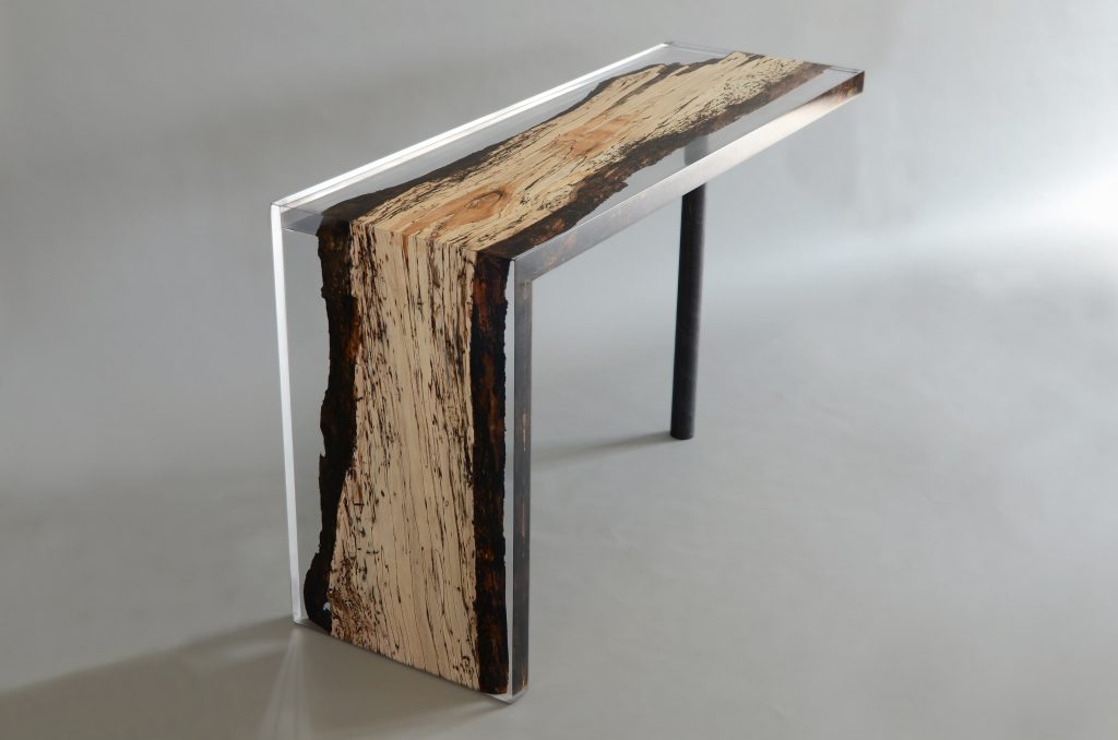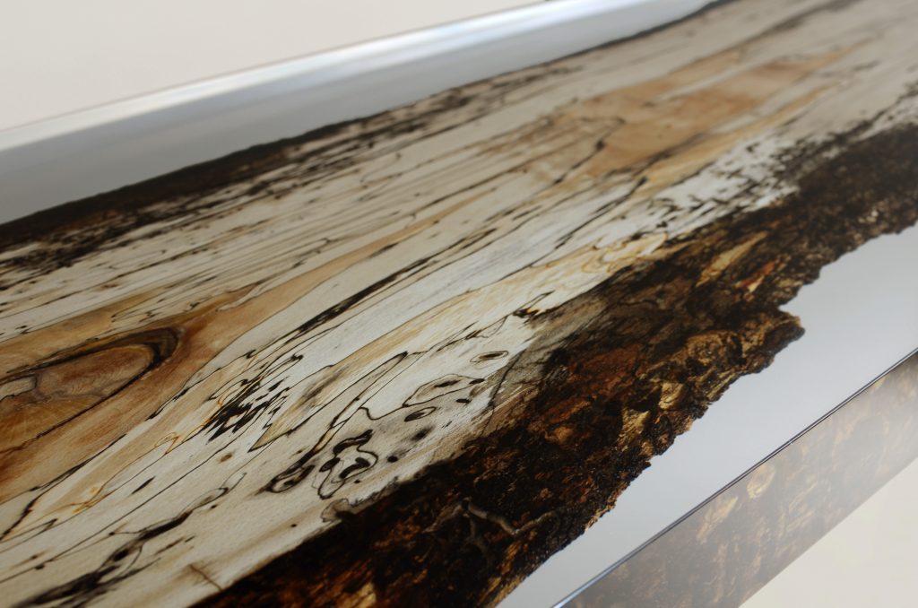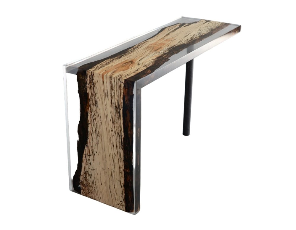 Fungi _ Console is made of a single SOLID WOOD plank obtained from an abandoned log with its fungi texture, preserved in EXTRACLEAR RESIN resembling the winter ice that blocked the fungal activity. While one leg is in BURNISHED STEEL, the other one uses the new alcarol's invisible corner joining, that ensures the continuity of both material, without visible separations between horizontal and vertical planes, like a single bent piece.