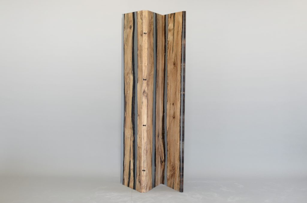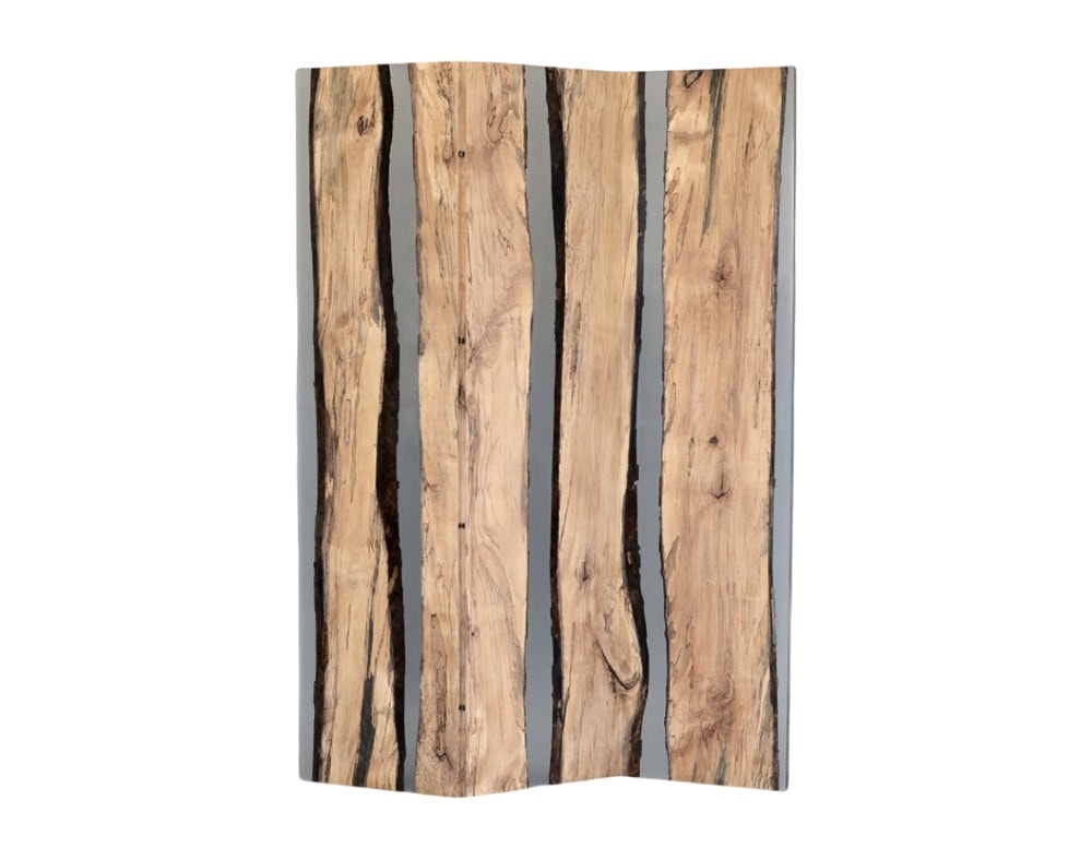 Fungi _ Screen is made of four BEECH WOOD boards, obtained by sawing dead trees with their fungi texture, preserved in EXTRACLEAR RESIN resembling the winter ice that blocked the fungal activity. Screen is dotated of concealed hinges in BURNISHED BRASS, with 180° opening angle.