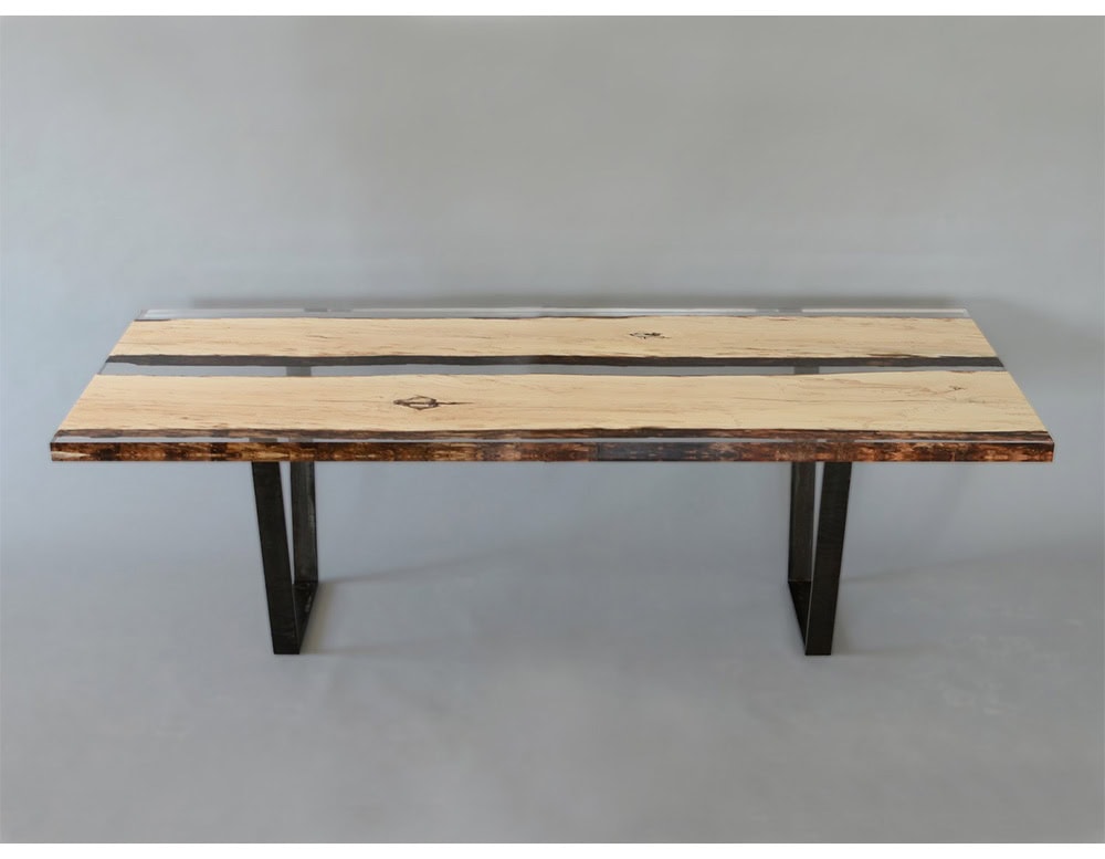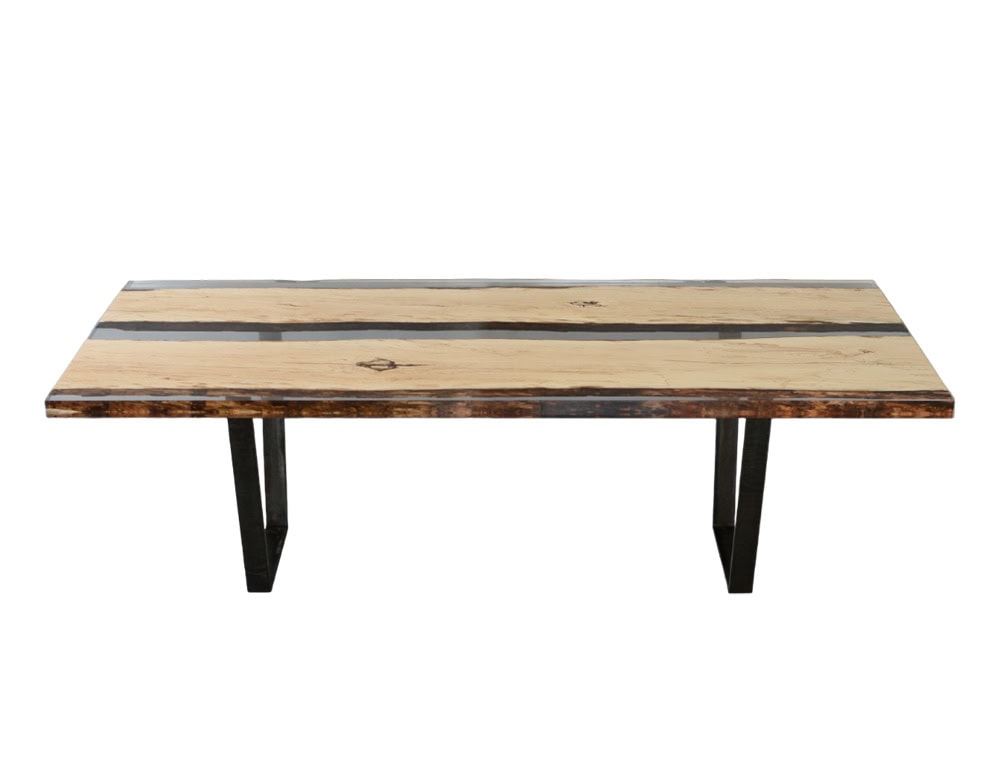 Fungi _Table is made of SOLID WOOD planks obtained from a very large log with its fungi texture, preserved in EXTRACLEAR RESIN resembling the winter ice that blocked the fungal activity. Legs are in BURNISHED STEEL.