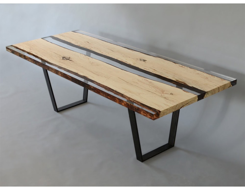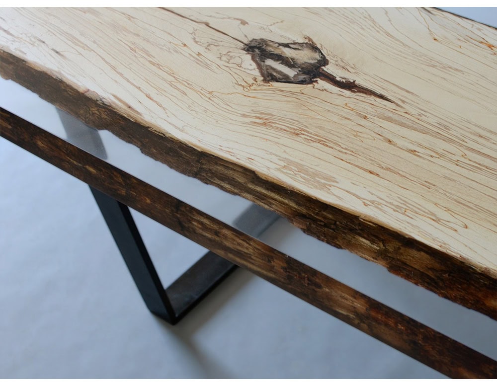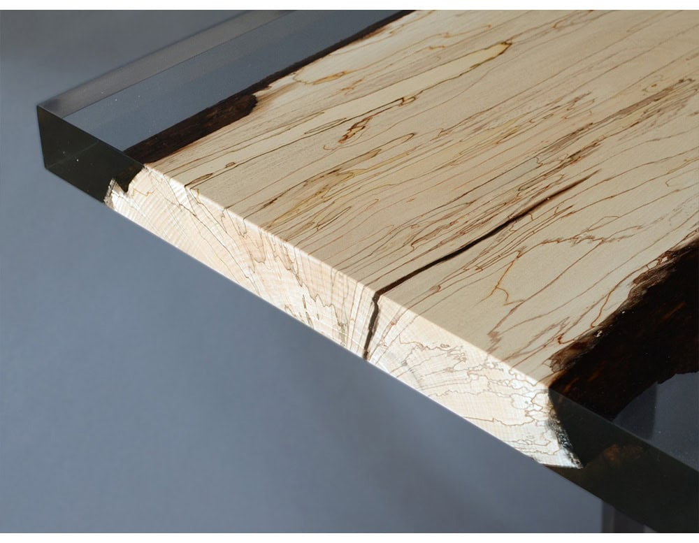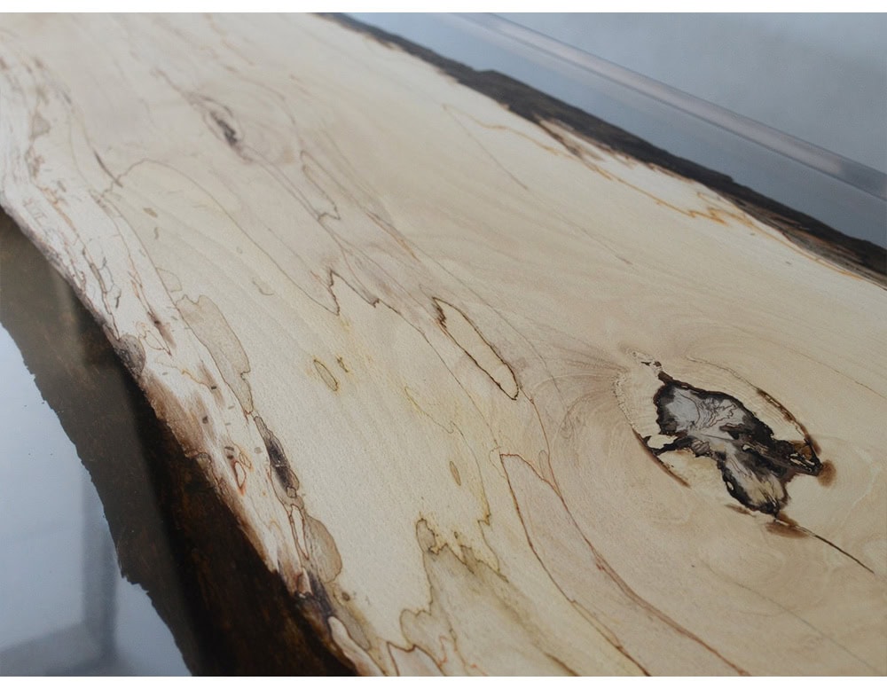 While the wood in section planes remains uncovered, the natural wood live edges are frozen in a special extraclear resin resembling the ice that in winter blocked the fungal activity. The transient beauty of Nature becomes eternal.