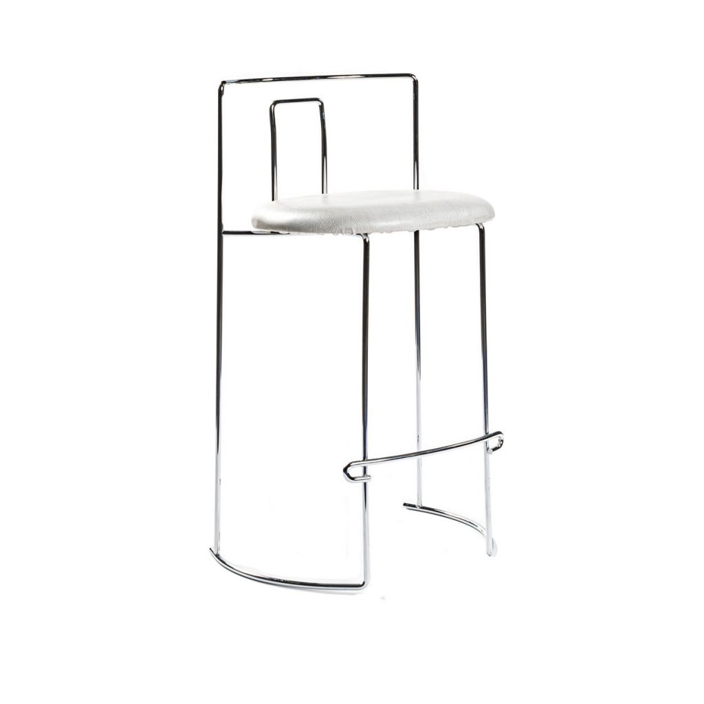 A barstool with seat cushion upholstered in a white leather - leathercloth: a101 white. Stool frame is made with ø 11 mm metal bar finished with chrome plating.