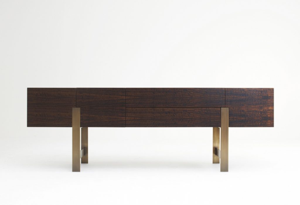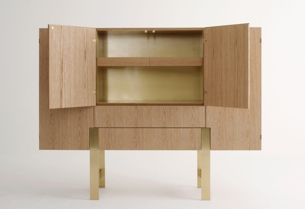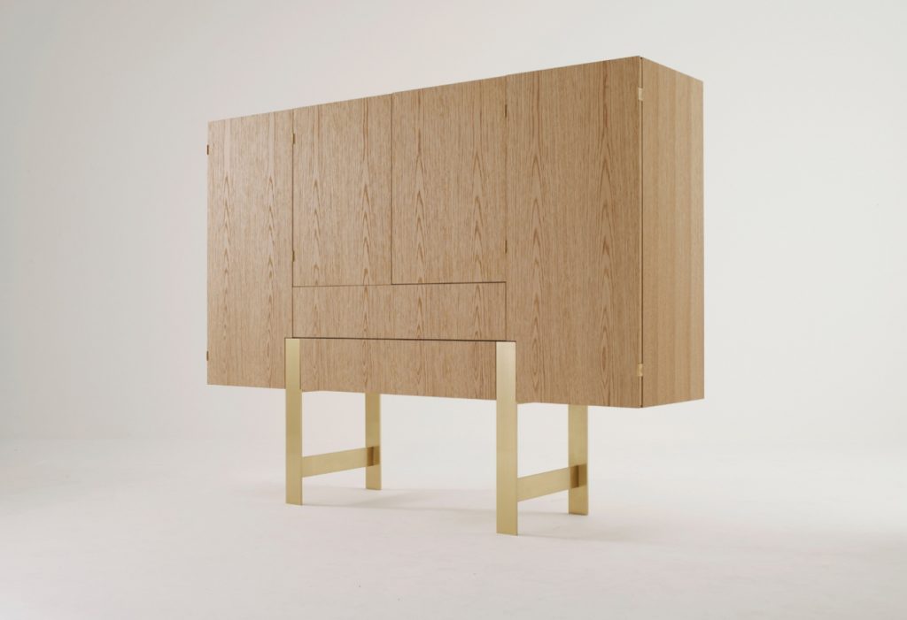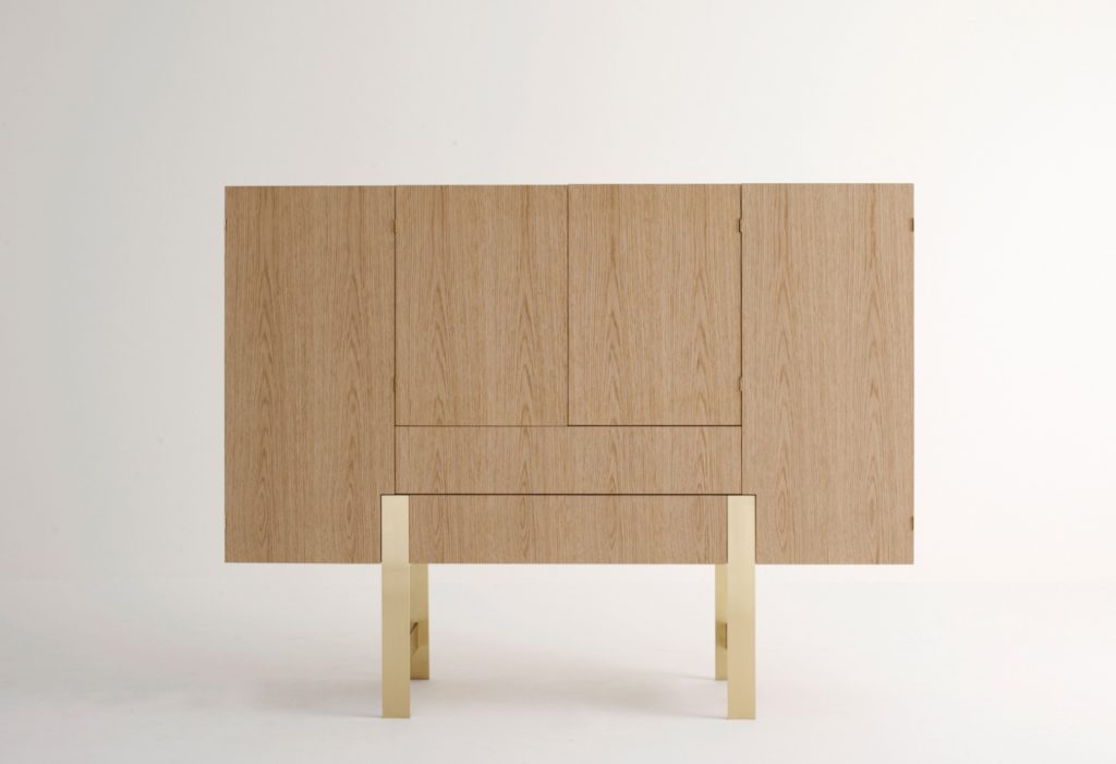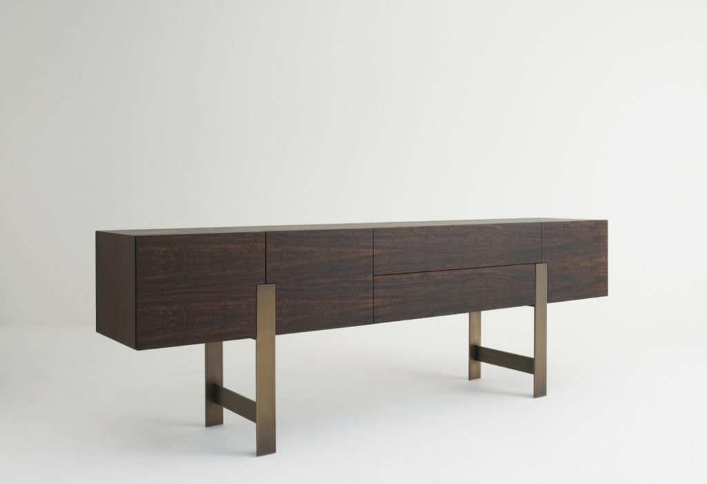 Series of storage units with structure made of veneered panels. Trestle base available in brass or in steel. Sideboards available in two versions: - low version, with doors or with doors and drawers; inner spaces equipped with an extra-white tempered glass shelf each - high version, equipped as a bar-cabinet or with shelves.