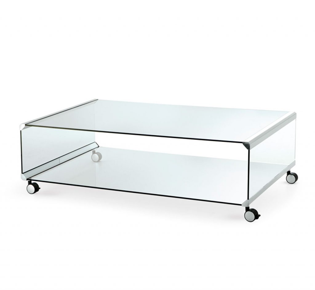 Coffee table in 8 mm transparent tempered glass. Bright stainless steel metal parts. Satin stainless steel, protected or embossed white or black lacquered brass metal parts on request. Available with or without castors (total height: 34cm).