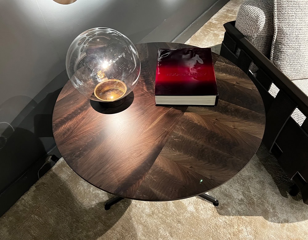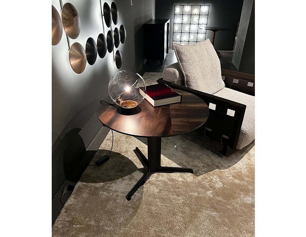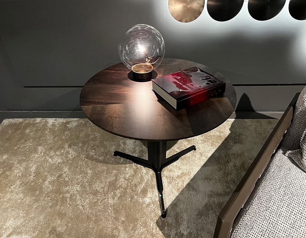 Side table with black burnished steel structure and wood veneered top (2cm thickness). Top in H-Piuma finish. This product is discontinued.