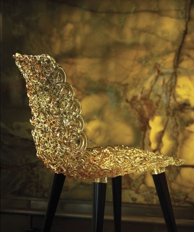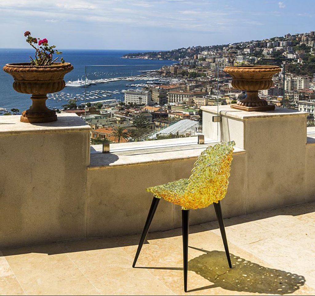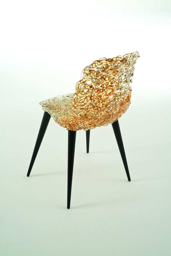 Light tricks and see-through for this chair with seat and back formed by a single thread that makes a precious handmade embroidery in polycarbonate. Each piece is unique and lays on four removable legs made of wood and painted in semi-glossy black. Precious and elegant, it perfectly fits in an ancient or contemporary setting.