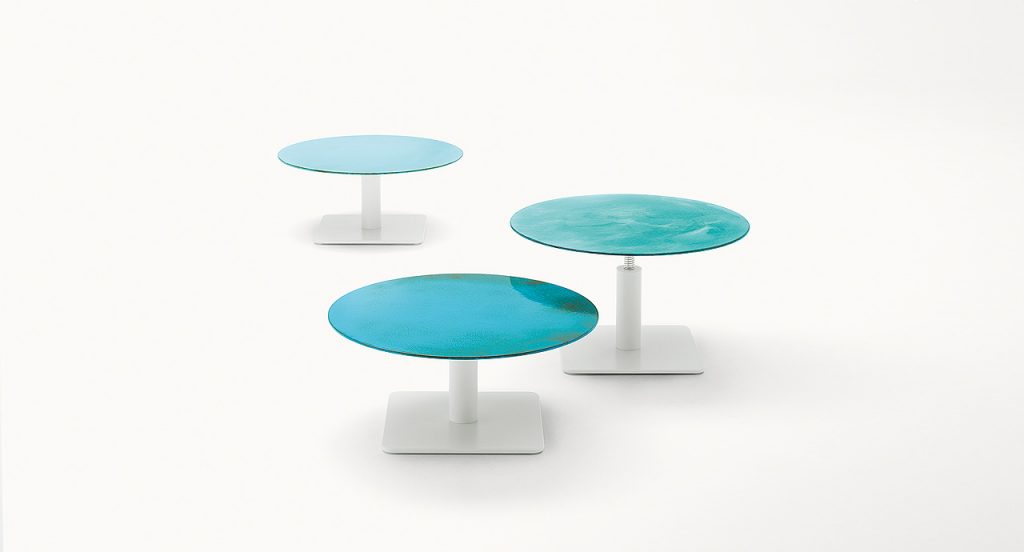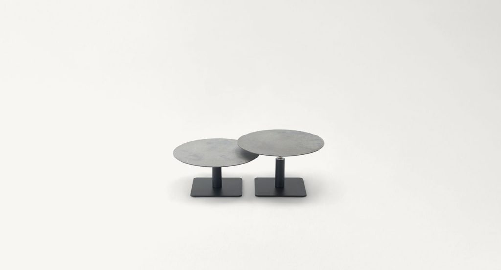 Side tables with round top. The series Giro also includes high tables available in the same finishes. - Structure: varnished aluminium in avorio, grafite or wengé colour. - Base: base made of varnished stainless steel; plastic spacers. - Top: rotating or fixed, in lightened concrete in avorio, grafite or wengé color, in Accoya® wood, in Venice, in Luce, in granite or in stainless steel varnished in avorio or grafite colour, matching the structure. The Luce tops are made and finished by hand with exclusive colours by Nicolò Morales. - Notes: The tops in Luce and in Venice are made by hand with natural materials, which react unpredictably to crafts production processes. Their surface can feature thickness differences, little marks, striping, little variations of colour tone and solidity. These characteristics are linked to the very nature of the materials and are considered qualities able to make each top in Luce unique and different from any other. Only combined with stainless steel tops, structure and base are liquid gloss varnished in avorio or grafite colour. - The cm 18,5 high side table has a fixed top. - This product can be used also in interior environments. - The use of a Winter Set protection cover is recommended. *Please note due to the nature of natural stone materials, this product must be brought indoors if the outdoor temperature reaches 32 degrees Fahrenheit or below.*