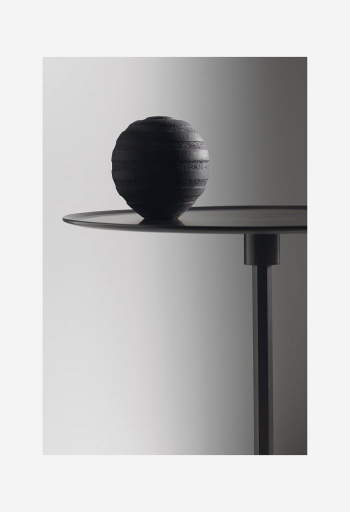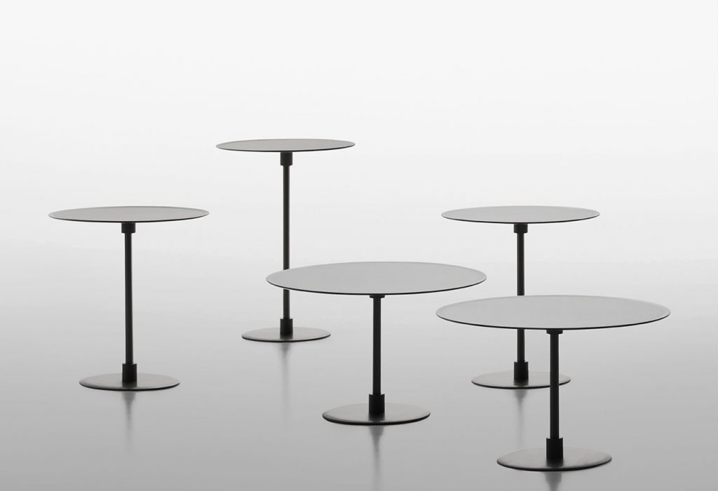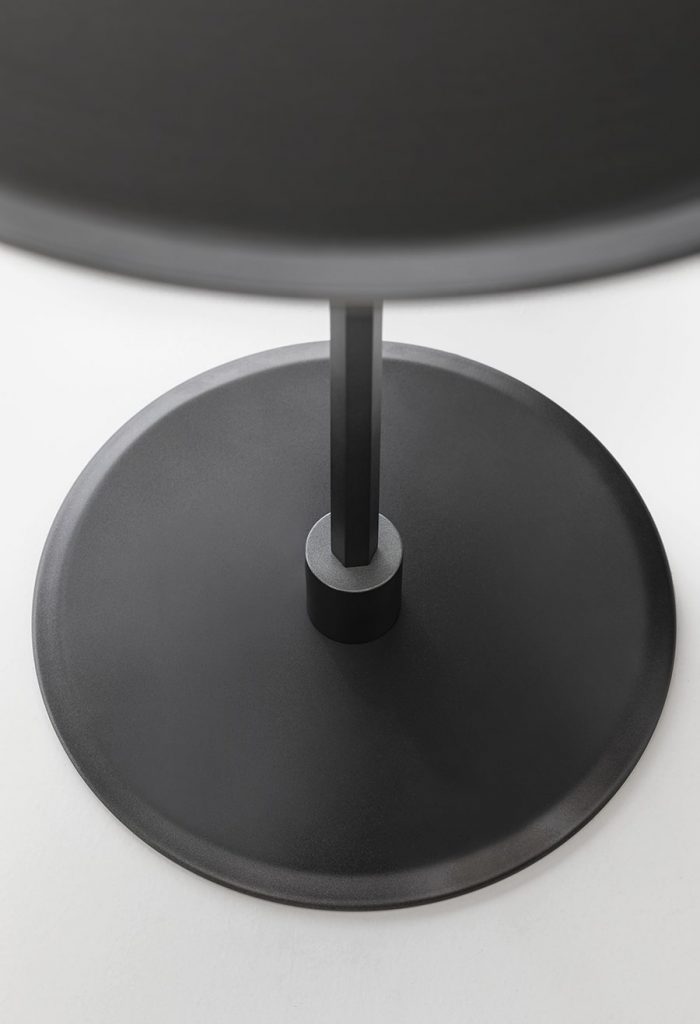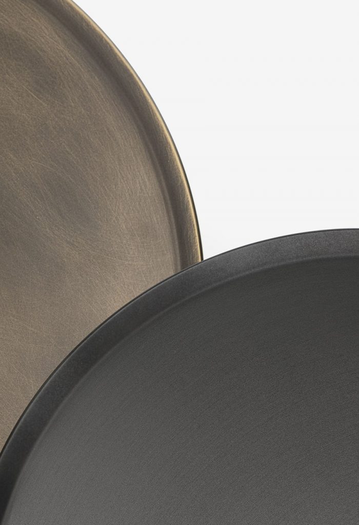 Emblematic of the rigorous designs of Gianfranco Frattini, the Gong side table reemerges with his quintessential grace and flair of form, now in diverse heights and diameters, a family of proportions for sculptures, plants, and other decors. In a muted brushed finish of brass or gunmetal, the metals present a new emphasis on materiality, with a column in the same color or contrasting in brass, and a tabletop and base in iron, all in gleaming, elemental purity.