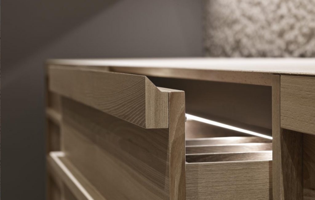 In this far-eastern land, the wall is shoji: without doors or windows, it contains everything in a single design. Lightweight in paper and wood, it filters the light in a natural way almost like an opening, a window. And again, its wooden slats mimic the function of the doors becoming opening handles and lead to another room or the outside. Like this linear game of natural materials and geometric balances, hanami uses the set of wooden slats as handles, creating a simultaneous interplay of shadow and light that hide the joints of the furniture piece. Wood as its maximum expression is proposed in a single-material key on both the doors and the handles and adapts to various solutions of openings: from the whole door, to the double basket and to the drawers. In all cases the signs disappear before the eye in a specific and ordered compositional scheme of strips. An exciting collective made of individual elements that become one to the eye. Combined with stone tops, it reproduces the japanese essence of cherry blossoms.