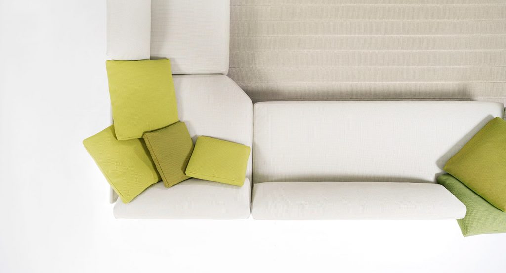 The Harbour series includes an armchair, a three-seater sofa, modular elements with right or left armrest, a central element, a chaise longue and a pouf.