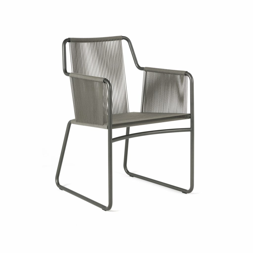 Outdoor armchair with its seat, back, and armrest formed from an olive-colored rope woven directly to the structure. The armchair structure is made from stainless steel with a powder coat finish in graphite.
