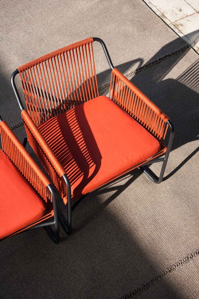 Our HARP outdoor lounge chair is a celebration of craft manufacturing: the powder coated stainless steel structure is hand- welded and the cords woven in a double polyester or acrylic twisted thread in a cotton finish. The different finishes and colours harmoniously integrate with any indoor, garden or patio furniture and in any context.